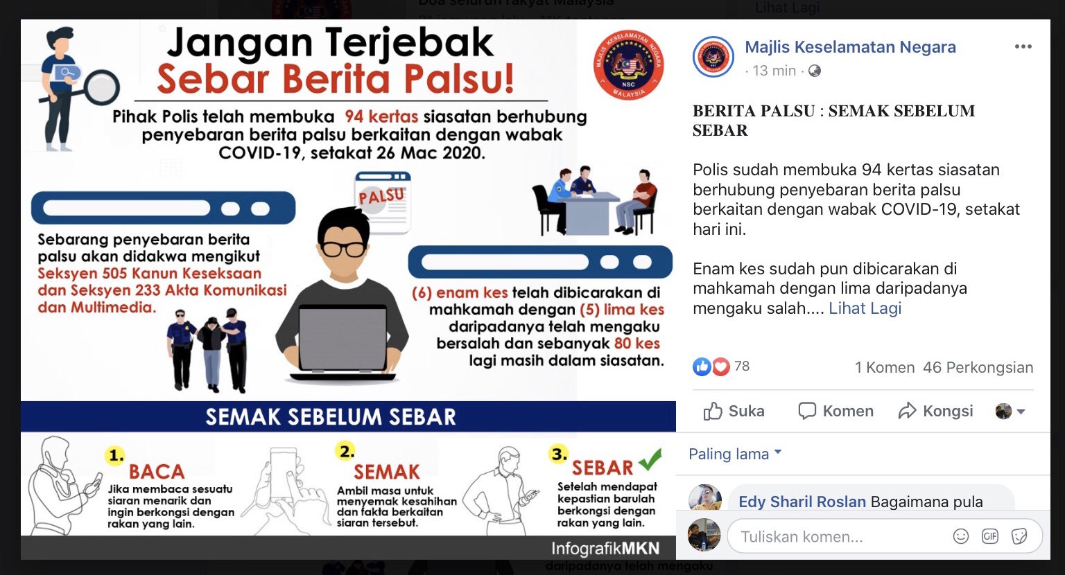 Justeru ketika kita diminta duduk diam di rumah untuk melawan wabak Covid-19 ini, jangan pula kita menghabiskan masa dengan mencipta berita yang tidak benar sehingga menimbulkan rasa panik dan cemas dalam kalangan masyarakat.