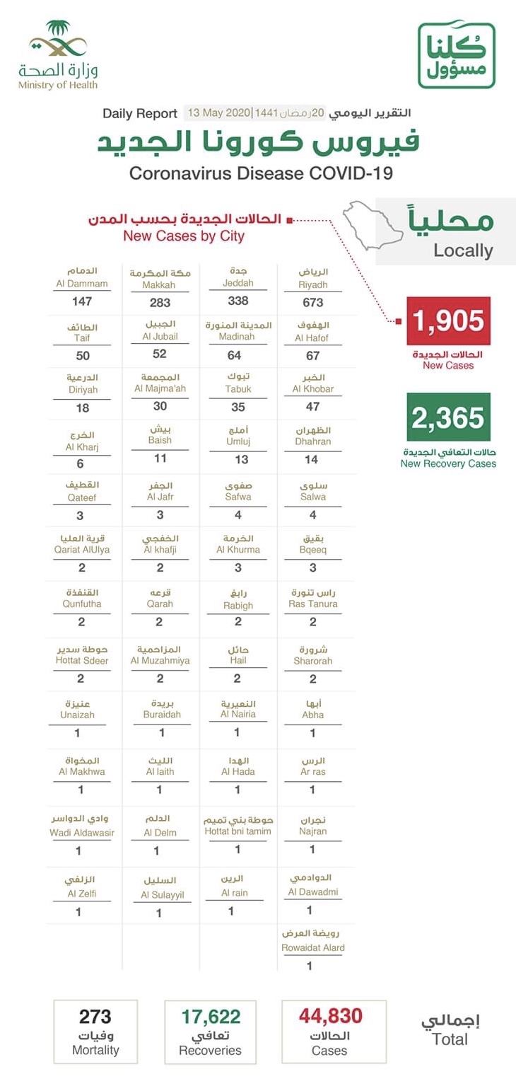 Riyadh mencatatkan kes tertinggi iaitu 673 diikuti Jeddah 338, Makkah 283 dan Dammam 147 Dammam. Madinah berada di kedudukan keenam dengan 64 kes.