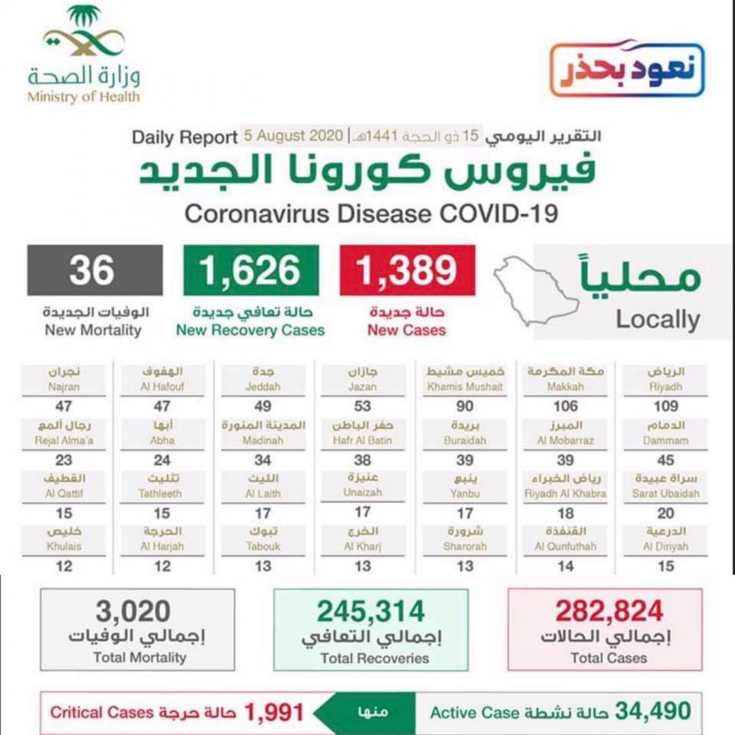 KEMENTERIAN Kesihatan (MOH) Arab Saudi hari ini, 5 Ogos 2020 mengumumkan 1,389 kes baharu jangkitan koronavirus Covid-19 yang membawa jumlah keseluruhan kes di negara itu sebanyak 281,435 kes.