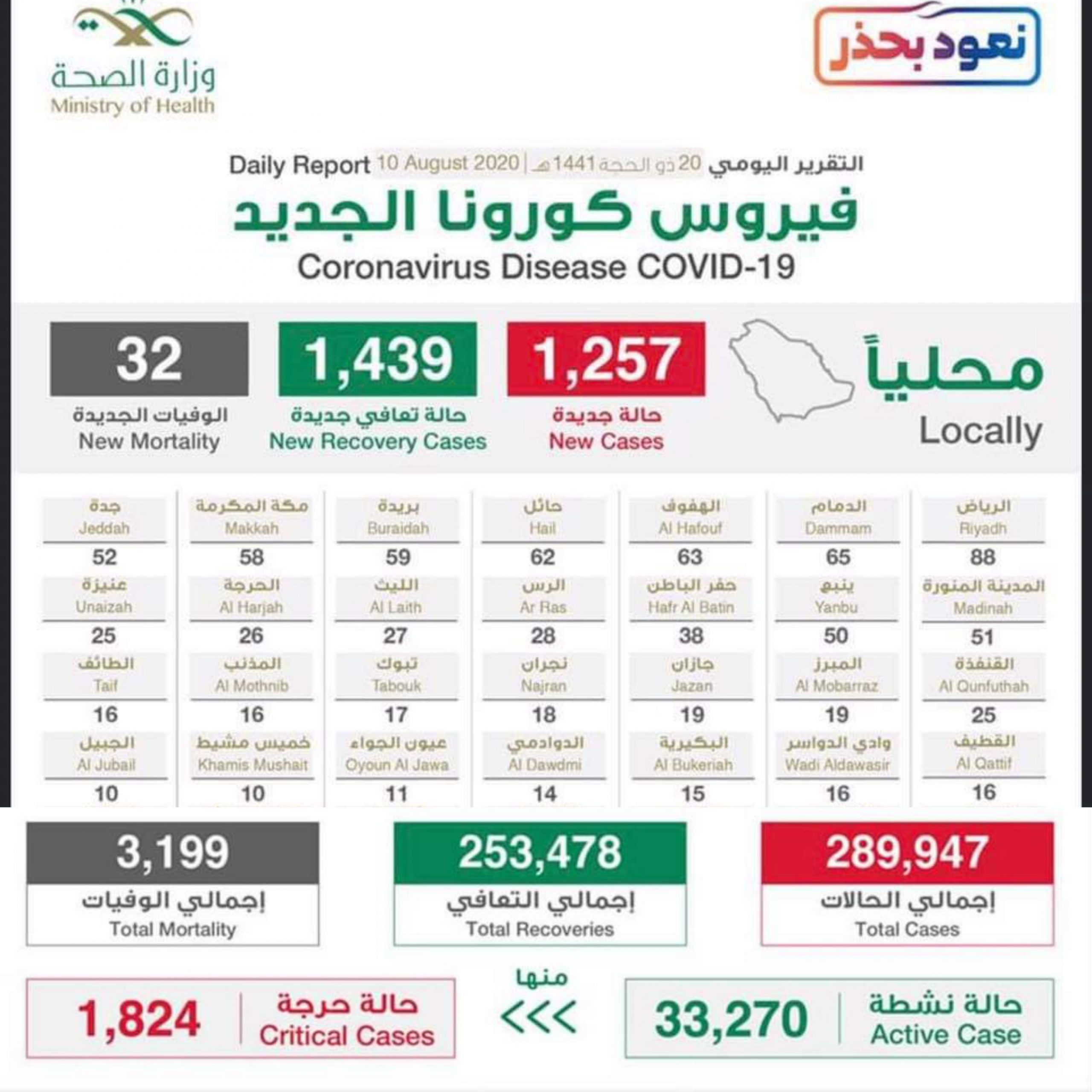 ARAB Saudi merekodkan 1,257 kes baharu Covid-19 dalam tempoh 24 jam yang membawa jumlah keseluruhan kes di negara itu meningkat kepada 289,947. Kementerian Kesihatan (MOH) dalam laporannya juga mengumumkan bagi tempoh yang sama, sebanyak 1,439 pesakit pulih menjadikan 253,478 kes sembuh. Kes kematian pula meningkat kepada 3,199 apabila 32 lagi disahkan meninggal dunia akibat Covid-19. Kes aktif pula sebanyak 33,270 di mana 1,824 adalah kritikal. Sementara itu tidak ada bandar atau kota yang merekodkan 100 kes atau lebih sebaliknya paling tinggi hanya 88 kes iaitu di Riyadh. Dammam mencatatkan 65…