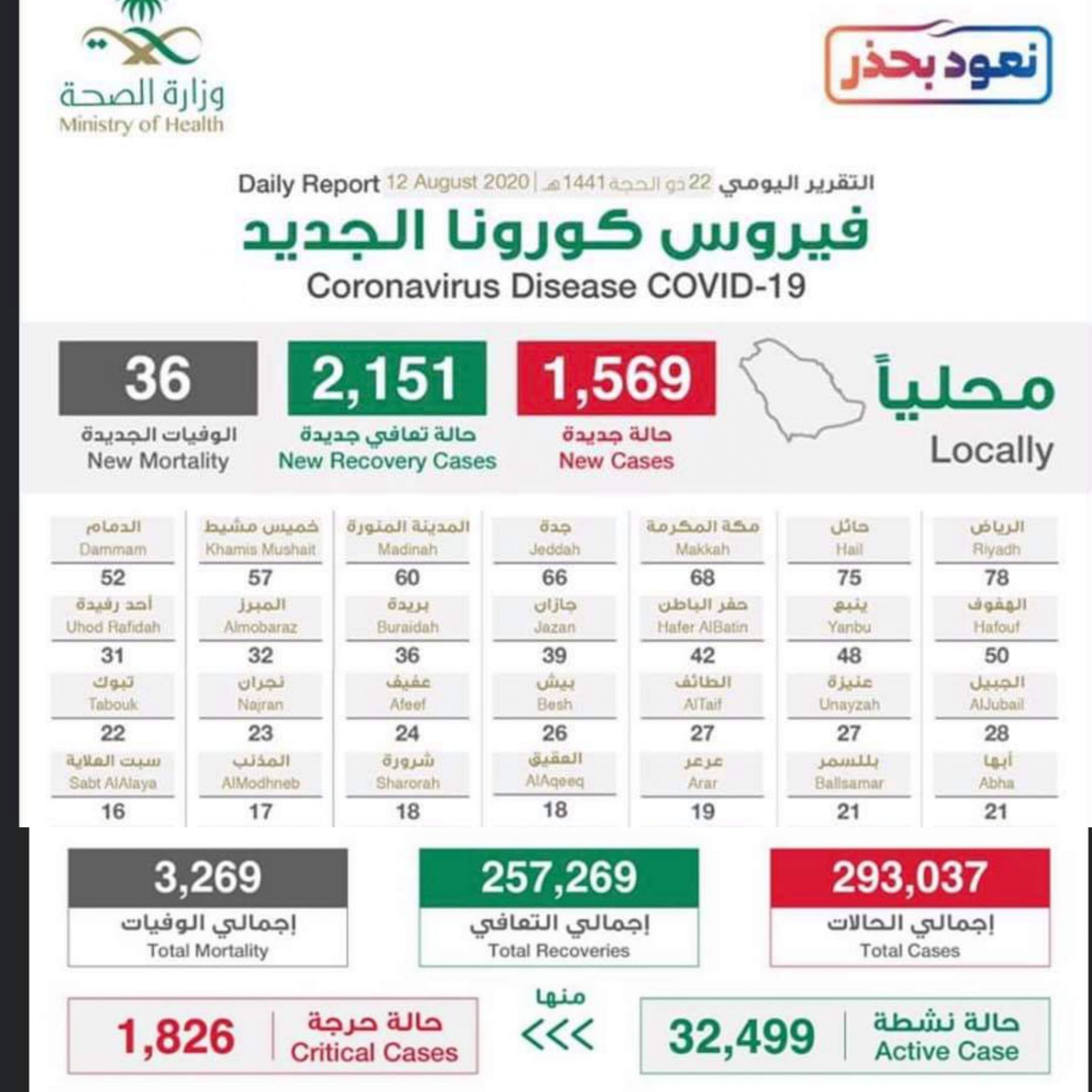 ARAB Saudi pada Rabu, 12 Ogos merekodkan 1,569 kes baharu Covid-19 dalam tempoh 24 jam menjadikan jumlah keseluruhan kes jangkitan di negara itu meningkat kepada 293,037. Jurucakap Kementerian Kesihatan (MOH) juga mengumumkan sebanyak 2,151 pesakit yang disahkan positif sembuh menjadikan jumlah kes pulih sebanyak 257,269. Pada masa yang sama MOH melaporkan 36 lagi kematian yang menjadikan jumlah yang meninggal dunia akibat jangkitan Covid-19 3,269. Kes aktif pula 32,499 di mana 1,826 kritikal. Sementara itu daripada 1,569 kes baharu yang dilaporkan, 78 kes direkodkan di Riyadh, Hail 75, Makkah 68, Jeddah…