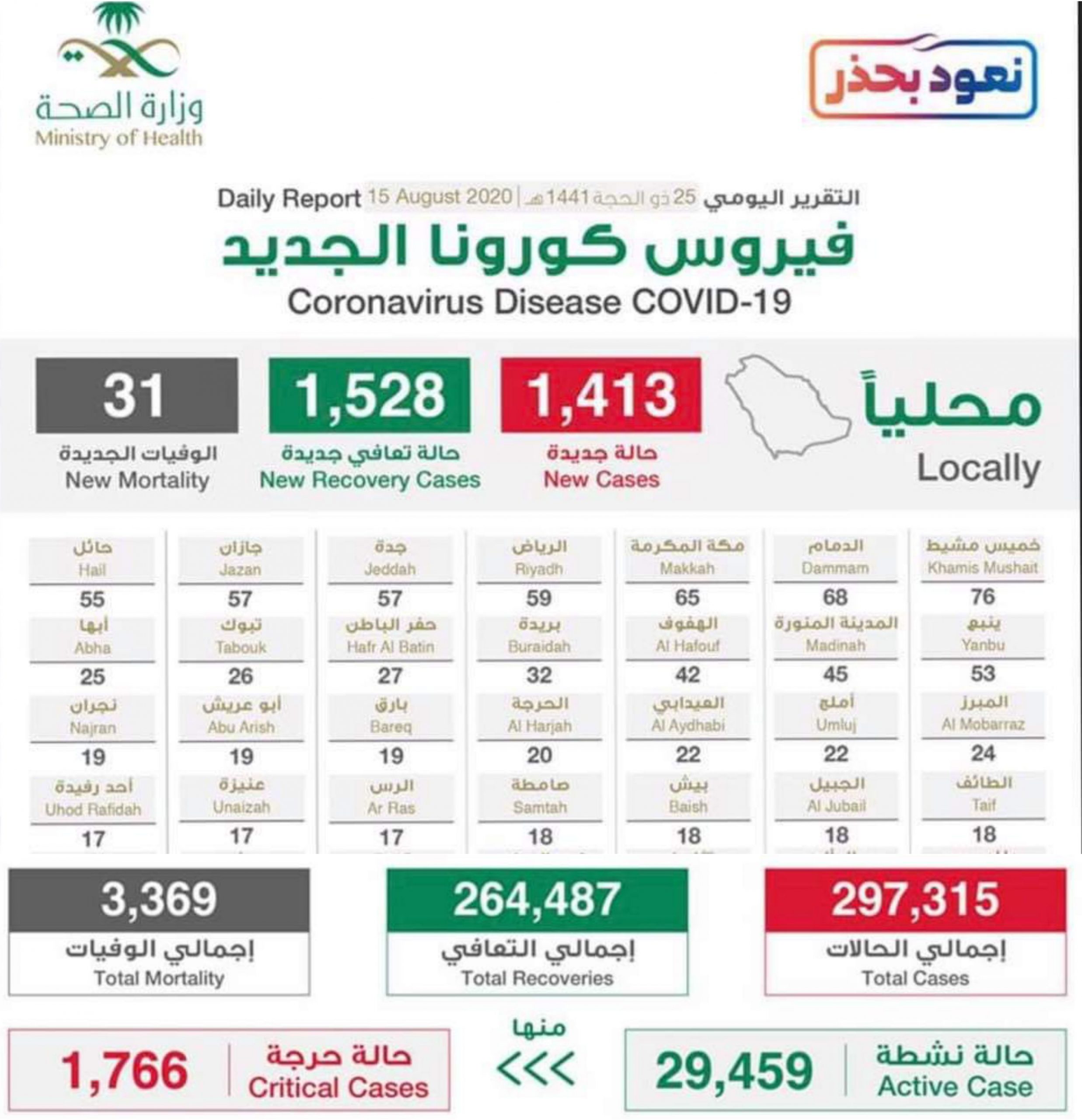 KEMENTERIAN Kesihatan Arab Saudi mencatatkan 31 lagi kematian akibat jangkitan koronaviris Covid-19 pada Sabtu, 15 Ogos yang membawa jumlah kematian setakat ini sebanyak 3,369.