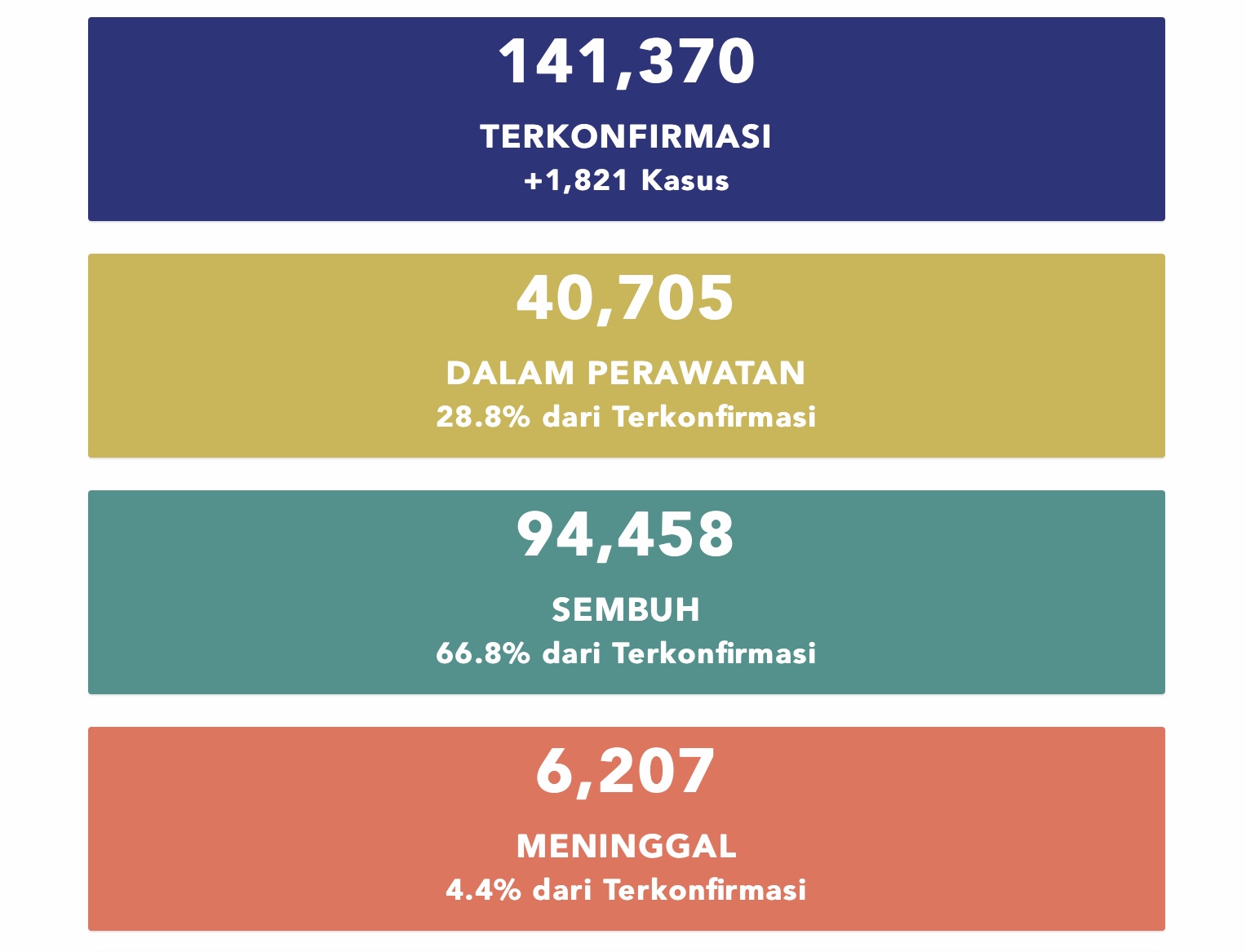 INDONESIA menambah kes positif Covid-19 selepas 1,821 kes baharu direkodkan menjadikan jumkah keseluruhan 141,370 kes manakala 78,659 pesakit lagi masih dalam pemantauan virus itu.