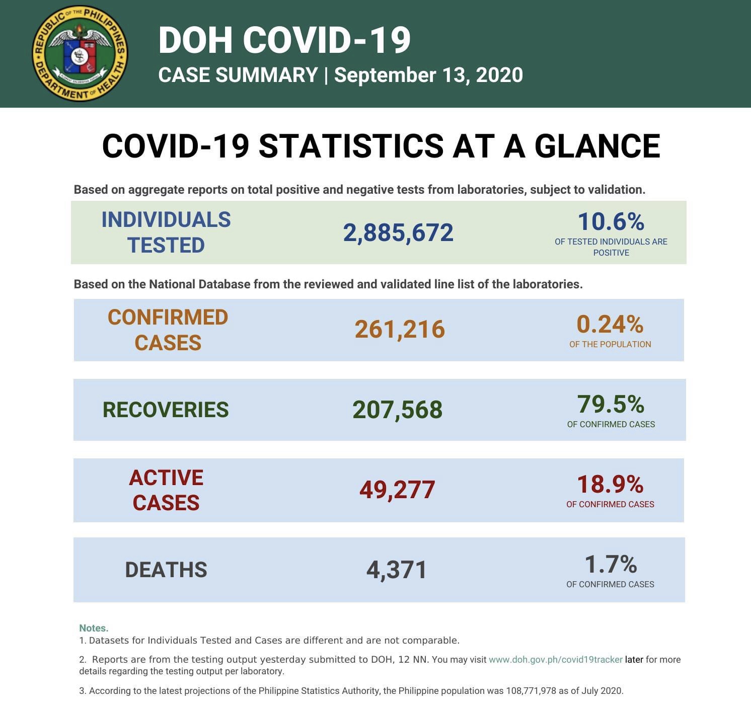 Jabatan Kesihatan Filipina (DoH) melaporkan setakat pukul 4 petang hari ini, sebanyak 3,372 kes dilaporkan, menjadikan jumlah keseluruhan kes 261,216.