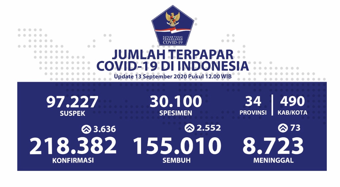 Menurut data yang disiarkan di laman sesawang rasmi pemerintah Indonesia berkenaan Covid-19, jumlah kematian pula meningkat kepada 8,723 orang termasuk 73 kematian yang dilaporkan hari ini.