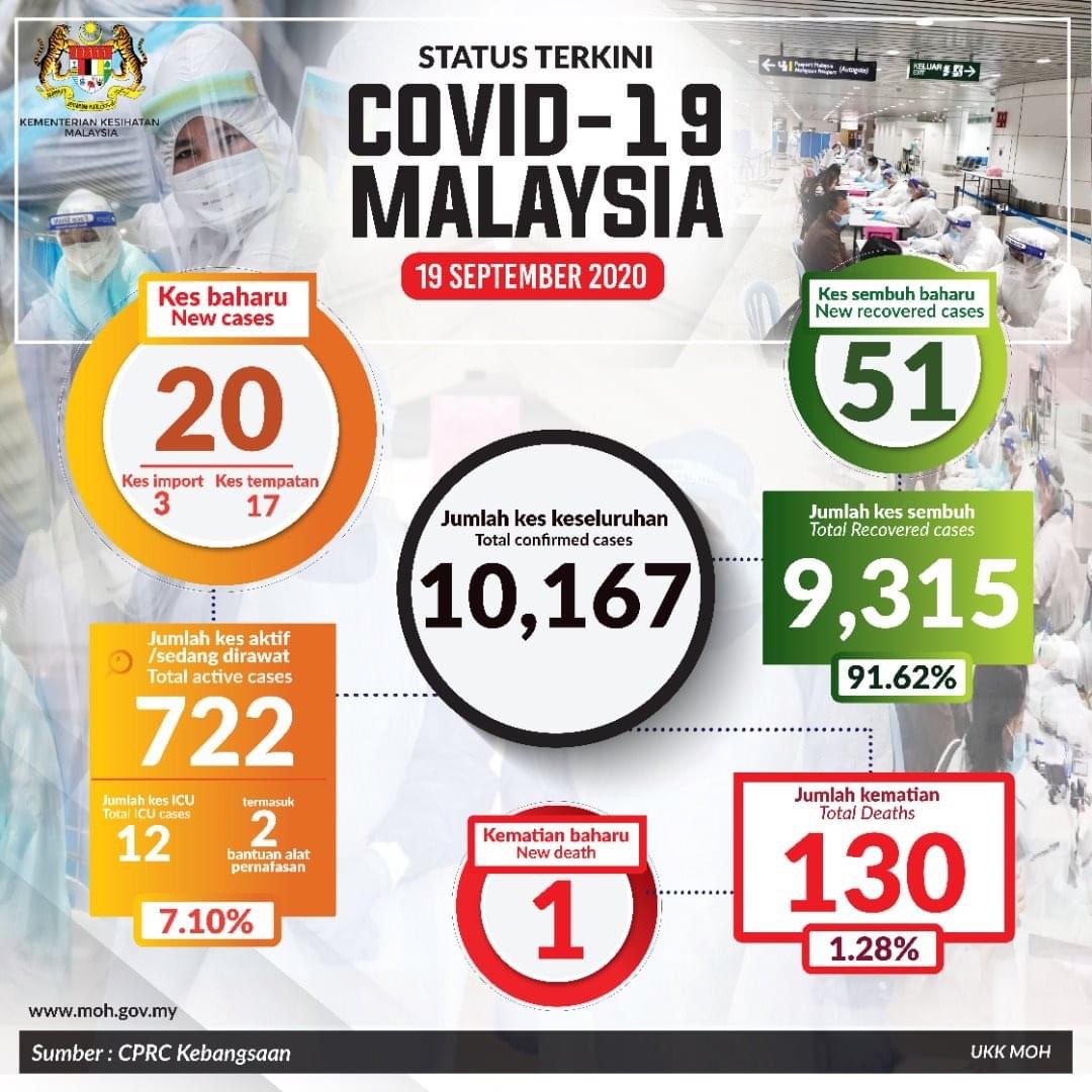 Dr Noor Hisham dalam satu kenyataan hari ini, 19 September berkata terdapat satu kes kematian berkaitan Covid-19 pada 5.45 petang semalam, menjadikan jumlah kumulatif kes kematian sebanyak 130 kes iaitu 1.28 peratus daripada jumlah keseluruhan kes.