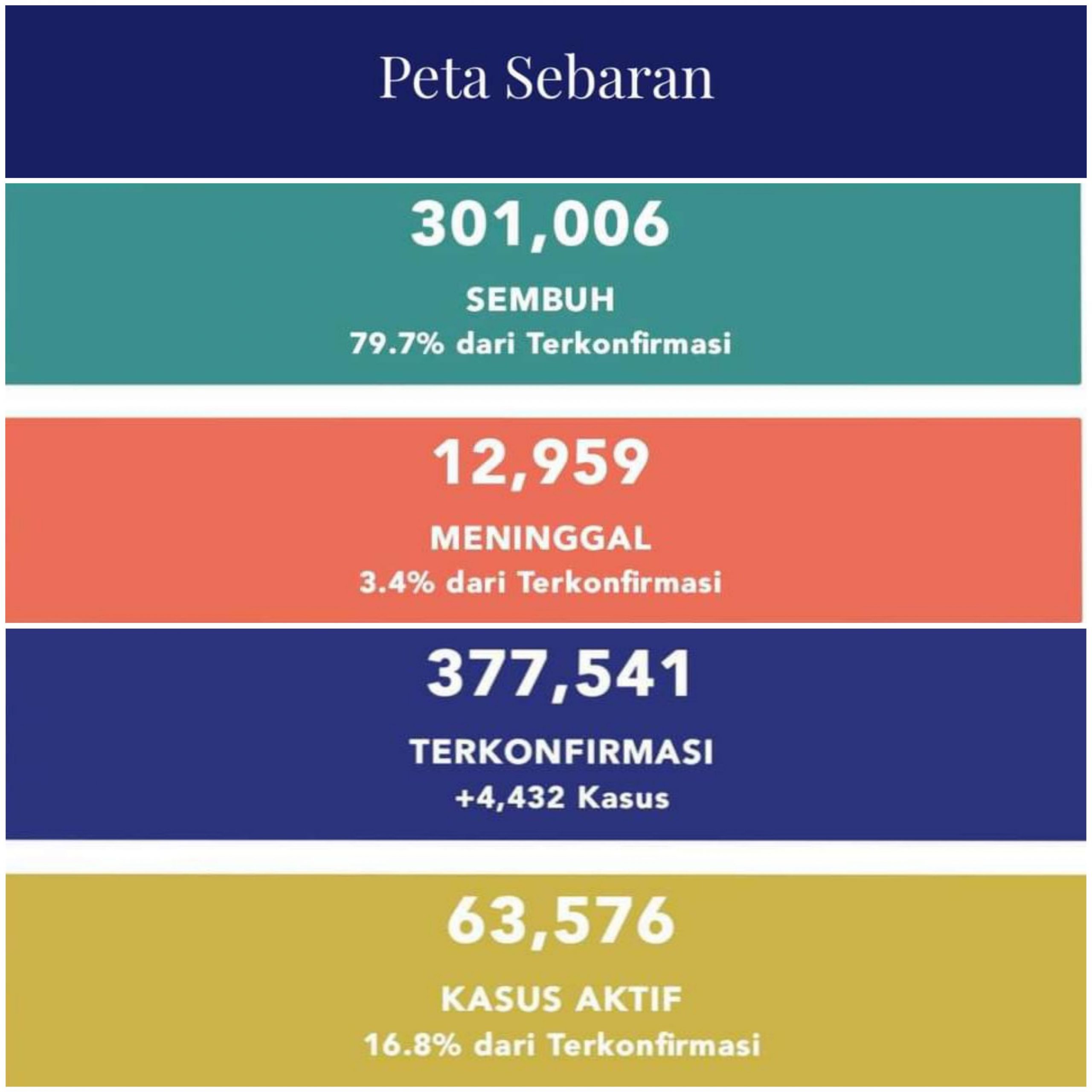 INDONESIA mencatatkan 4,432 jangkitan baharu Covid-19 dalam tempoh 24 jam yang membawa jumlah keseluruhan kes di republik itu meningkat kepada 377,541.