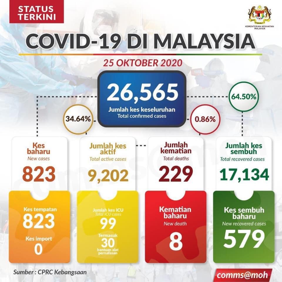 Status Terkini COVID-19 Di Malaysia, 25 Okt 2020 Kes sembuh=579 Jumlah kes sembuh=17,134 kes Kes baharu positif=823 (kes import=0, kes tempatan=823) Jumlah positif=26,565 kes Kes kematian=8 Jumlah kes kematian=229 kes Kes dirawat di ICU=99 kes Bantuan Alat Pernafasan=30 kes