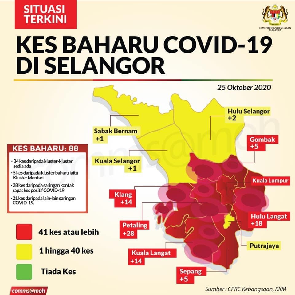 TIADA lagi zon Hijau di Selangor ! Sabak Bernam, satu-satunya daerah dalam zon hijau sebelum ini bertukar kepada zon Kuning hari ini, 25 Oktober. Sebanyak 88 kes baharu dilaporkan di Selangor yang turut melibatkan satu kes di Sabak Bernam. Hulu Langat, Gombak, Klang, Petaling, Kuala Langat dan Sepang berada di zon merah. Negeri-negeri di Lembah Klang juga kini berada di bawah Perintah Kawalan Pergerakan Bersyarat (PKPB).
