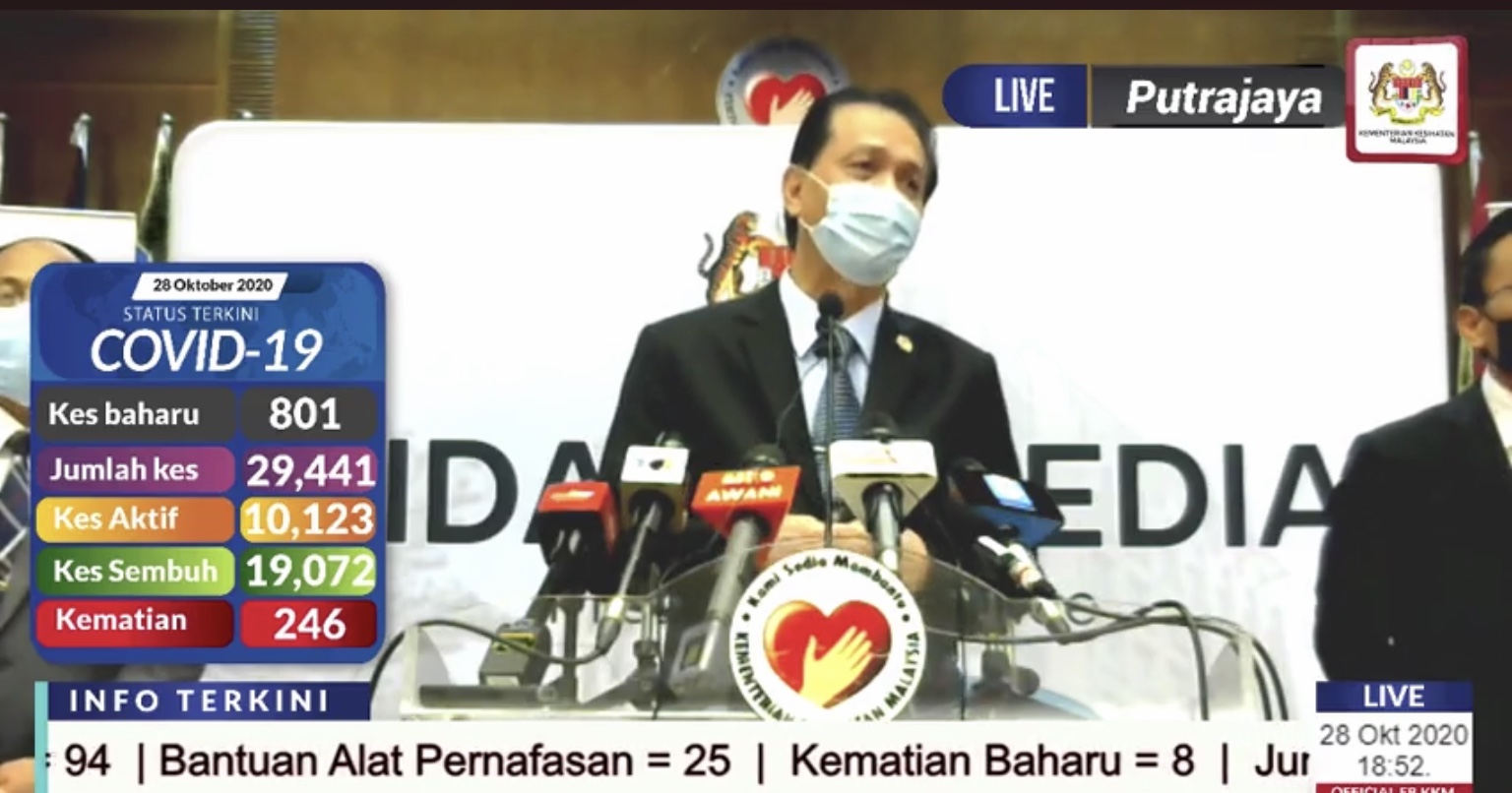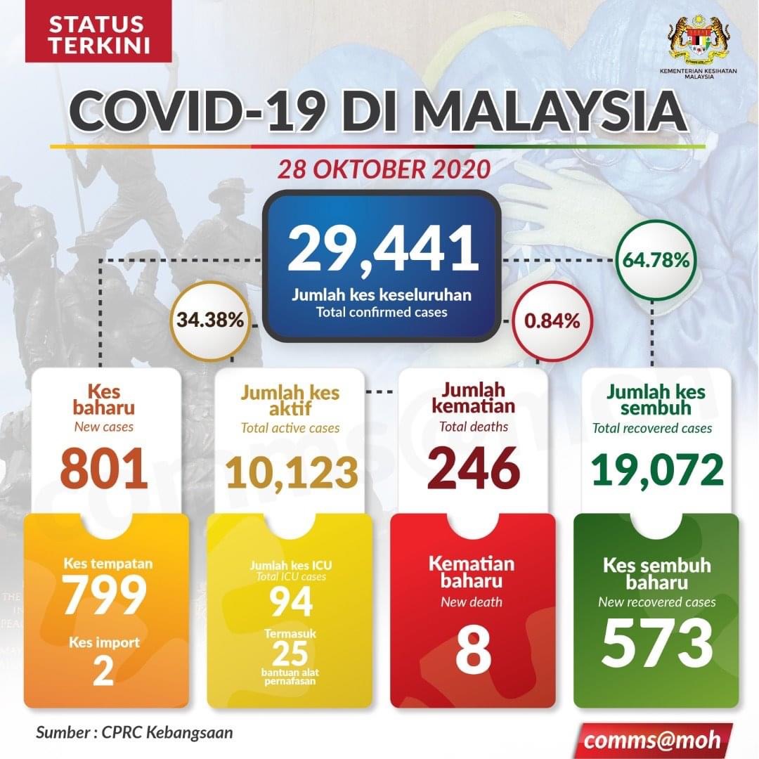PUTRAJAYA : Malaysia mencatatkan sebanyak 801 jangkitan baharu menjadikan jumlah kumulatif kes COVID-19 dalam negara kini ialah 29,441 kes. Ketua Pengarah Kesihatan, Dr. Noor Hisham Abdullah berkata, daripada jumlah itu sebanyak dua kes import yang menerima jangkitan dari luar negara manakala selebihnya merupakan penularan tempatan. Dua kes import mendapat jangkitan dari luar negara yang melibatkan seorang warganegara dan seorang bukan warganegara. Jumlah kes aktif dengan kebolehjangkitan Covid-19 kini sebanyak 10,123 kes. Menurut Dr Noor Hisham, dalam tempoh 24 jam juga, Sabah mencatatkan sebanyak 546 kes (68.2 peratus) manakala negeri-negeri di…