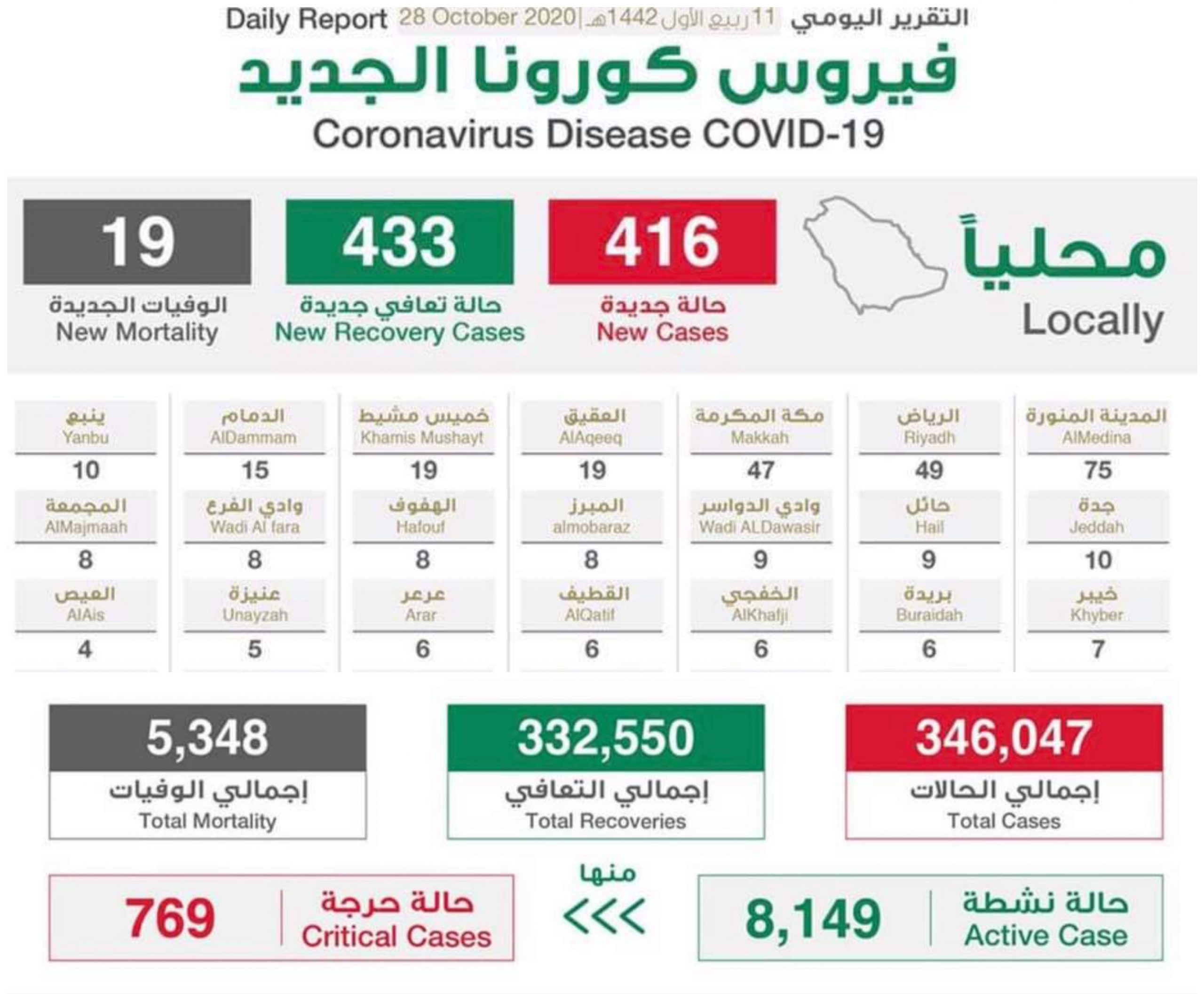 ARAB Saudi merekodkan 416 kes koronavirus Covid-19 dalam tempoh 24 jam yang membawa jumlah keseluruhan 346,047 kes. Menurut Kementerian Kesihatan, sebanyak 19 kematian direkodkan yang menjadikan jumlah kumulatif 5,348 kematian. Sebanyak 433 kes pulih dicatatkan bgai tempoh 12 tengah hari semalam dan 12 tengah hari ini, 28 Oktober. Ini menjadikan jumlah kes sembuh meningkat kepada 332,550 atua 96.09 peratus daripada keseluruhan kes. Sementara itu, Madinah terus mencatatkan kes harian tertinggi iaitu 75 kes diikuti Riyadh 49, Makkah 47 manakala Jeddah 10 kes. Sebanyak 58,861 ujian saringan dilakukan dalam tempoh 24…