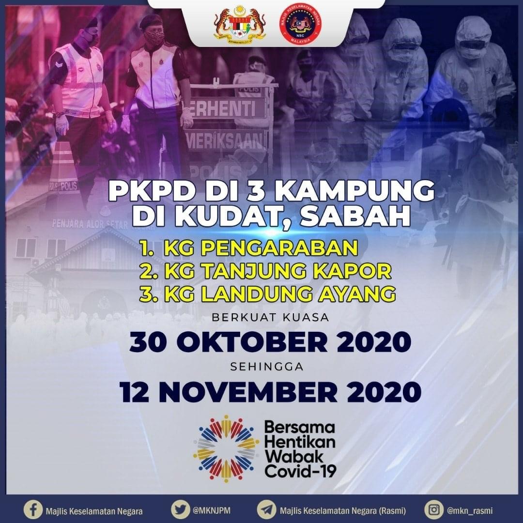 KUALA LUMPUR: Kerajaan mengumumkan pelaksanakan Perintah Kawalan Pergerakan Diperketatkan (PKPD) di Kampung Pengaraban, Kampung Tanjung Kapor dan Kampung Landung Ayang di Kudat bermula 30 Oktober sehingga 12 November depan. Menteri Kanan (Keselamatan), Ismail Sabri Yaakob berkata, PKPD bagi ketiga-tiga lokaliti berkenaan merangkumi sebanyak 2,393 unit rumah yang melibatkan seramai 13,884 penduduk. Pada masa yang sama, Perintah Kawalan Pergerakan Bersyarat (PKPB) di Labuan dilanjutkan selama 14 hari lagi bermula 31 Oktober sehingga 13 November depan. Kerajaan sebelum ini telah mengumumkan pelaksanaan PKPB di seluruh Labuan bermula 17 Oktober sehingga 30 Oktober.…