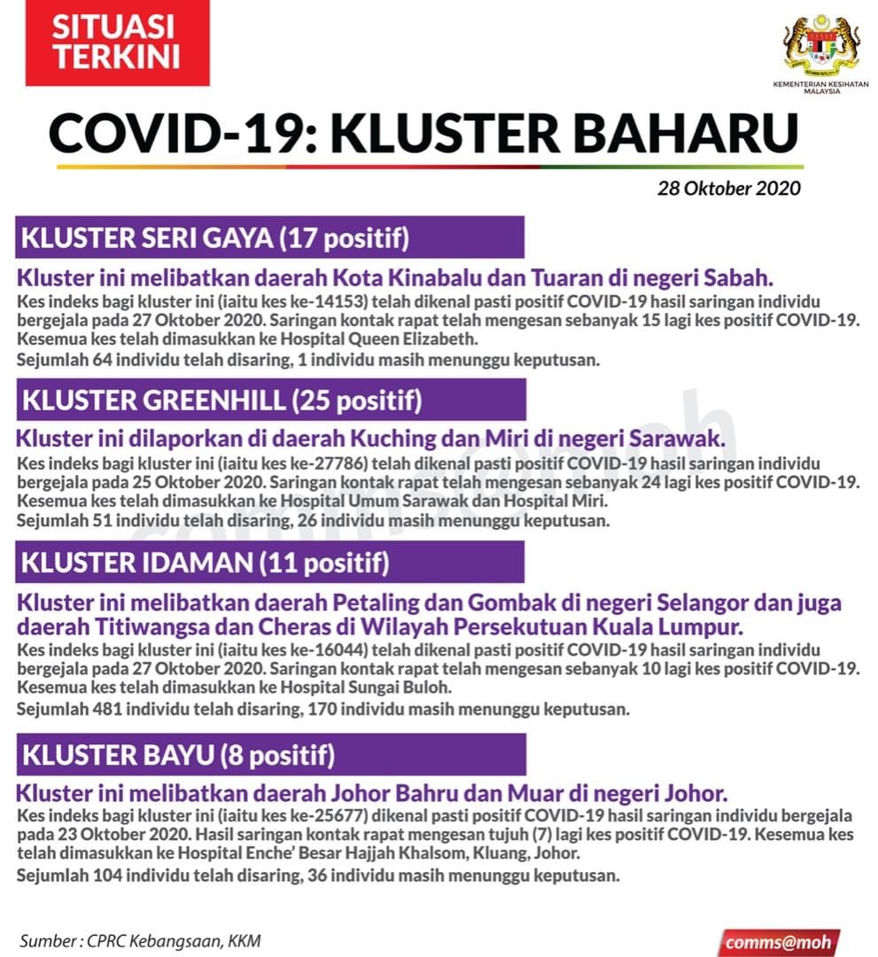 KEMENTERIAN Kesihatan mengumumkan empat lagi kluster baharu yang secara keseluruhan menyumbang 61 kes positif.