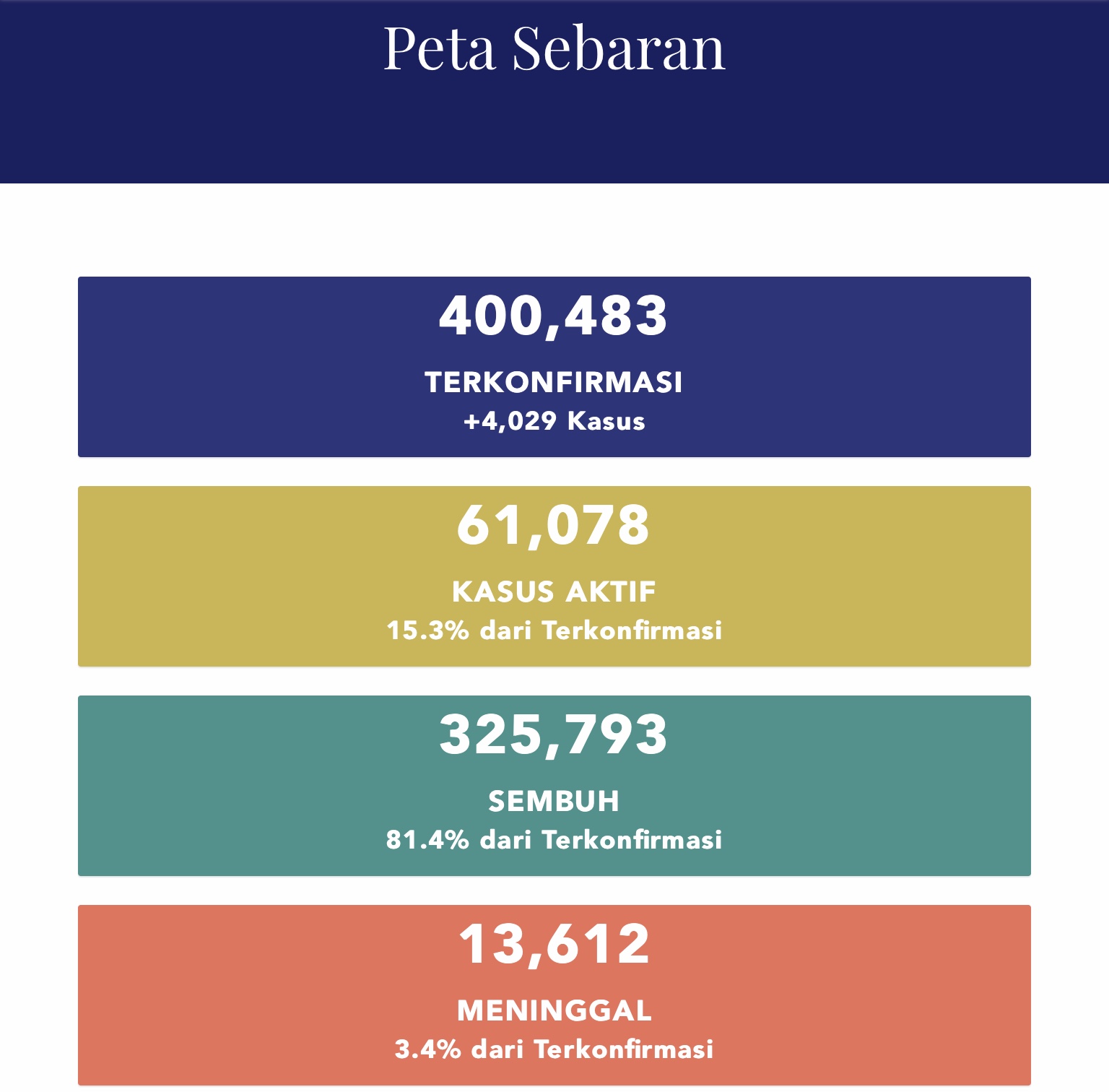 JAKARTA : Kes jangkitan Covid-19 di Indonesia kini melepasi angka 400,000 selepas merekodkan angka keseluruhan kes sebanyak 400,483 termasuk 4,029 kes baharu yang dicatatkan dalam tempoh 24 jam, sejak 12 tengah hari semelam, 27 Oktober.