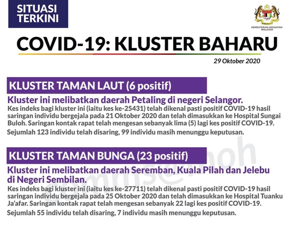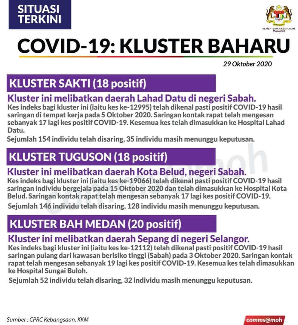Lima kluster baharu dikesan hari ini melibatkan negeri Sabah (2 kluster), Selangor (2) dan Negeri Sembilan (1).
