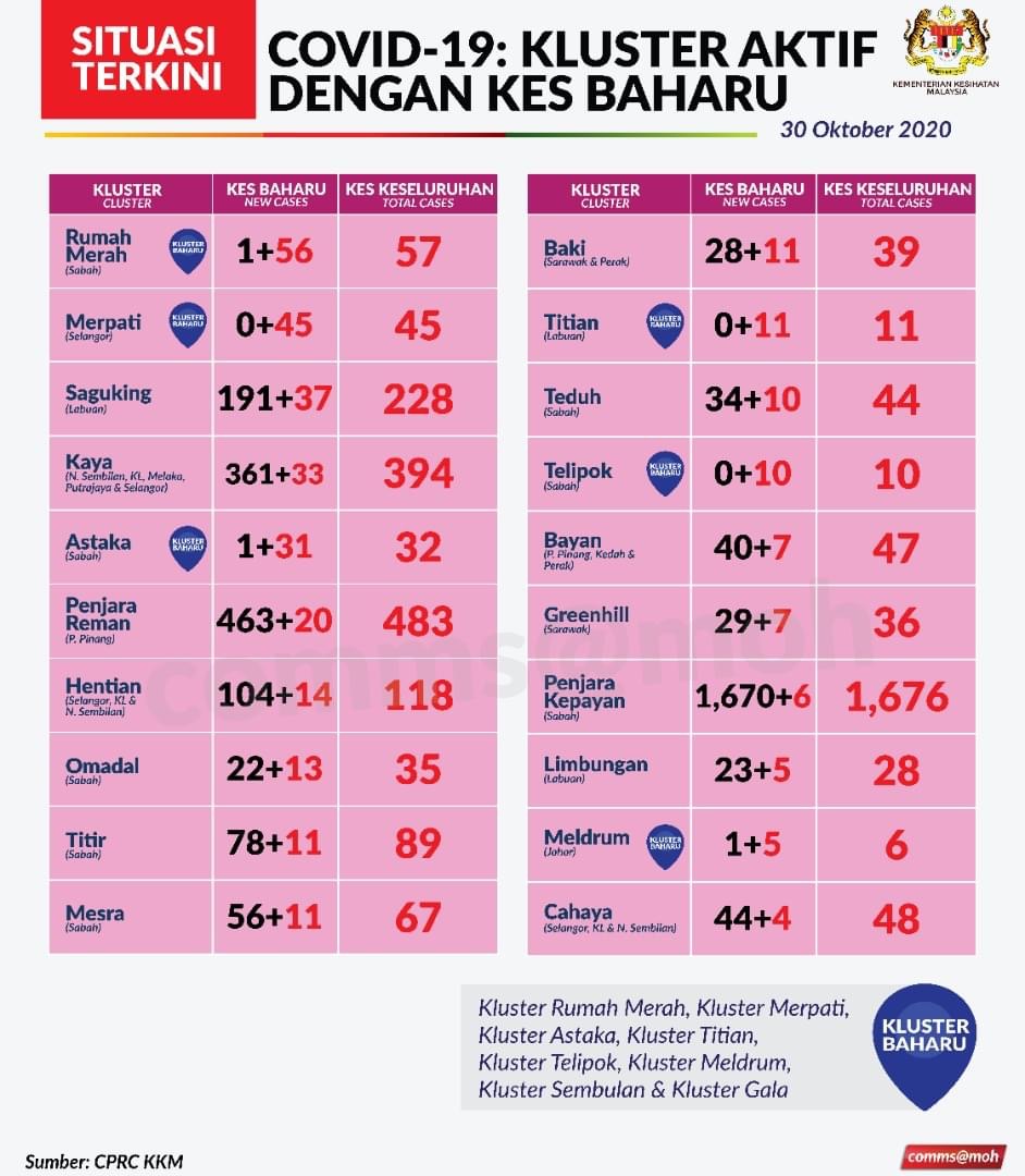 SEBANYAK 39 kluster aktif termasuk lapan kluster baharu melaporkan kes baharu hari ini, 30 Oktober 2020. Daripada kesemua jumlah tersebut, Kluster Rumah Merah di Sabah melaporkan kes tertinggi iaitu 56 kes hari ini. Selain itu, Kluster Merpati (baharu) turut melaporkan kes tertinggi iaitu 45 kes.