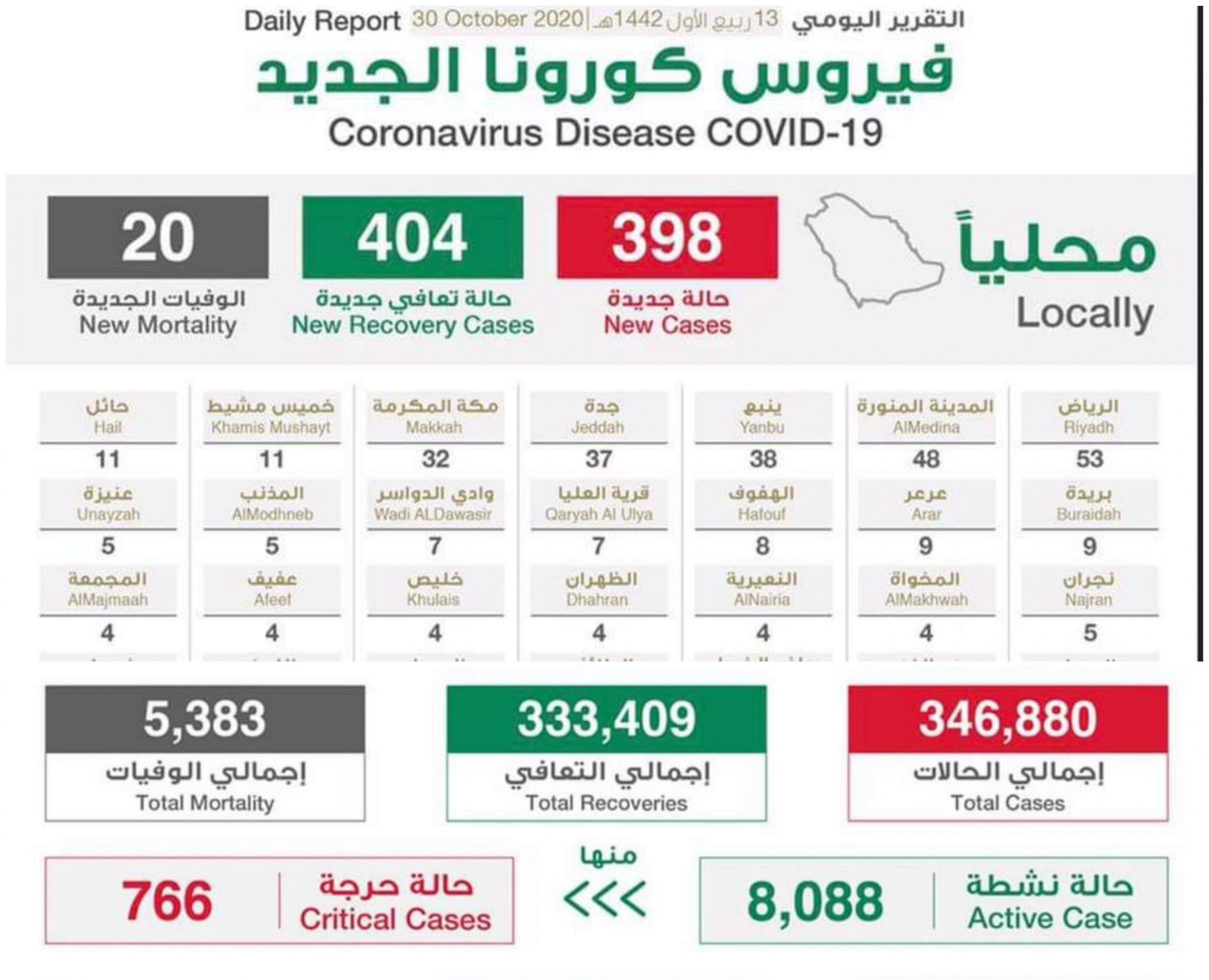 KES jangkitan Covid-19 di Arab Saudi menunjukkan penurunan hari ini, 30 Oktober dengan jumlah kes baharu yang direkodkan sebanyak 398 berbanding 435 kes yang dilaporkan semalam. Menurut Kementerian Kesihatan, dengan perkembangan ini jumlah kumulatif kes yang dicatatkan Arab Saudi setakat ini meningkat kepada 346,880 kes sementara kes aktif pula 8,088 dan daripada jumlah itu 766 adalah kritikal. Sebanyak 20 lagi pesakit meninggal dunia akibat Covid-19 yang membawa jumlah keseluruhan 5,383 kematian. Bagi kes sembuh pula, sebanyak 433 lagi pesakit pulih dan ini membawa kepada peningkatan kes sembuh daripada Covid-19 kepada…