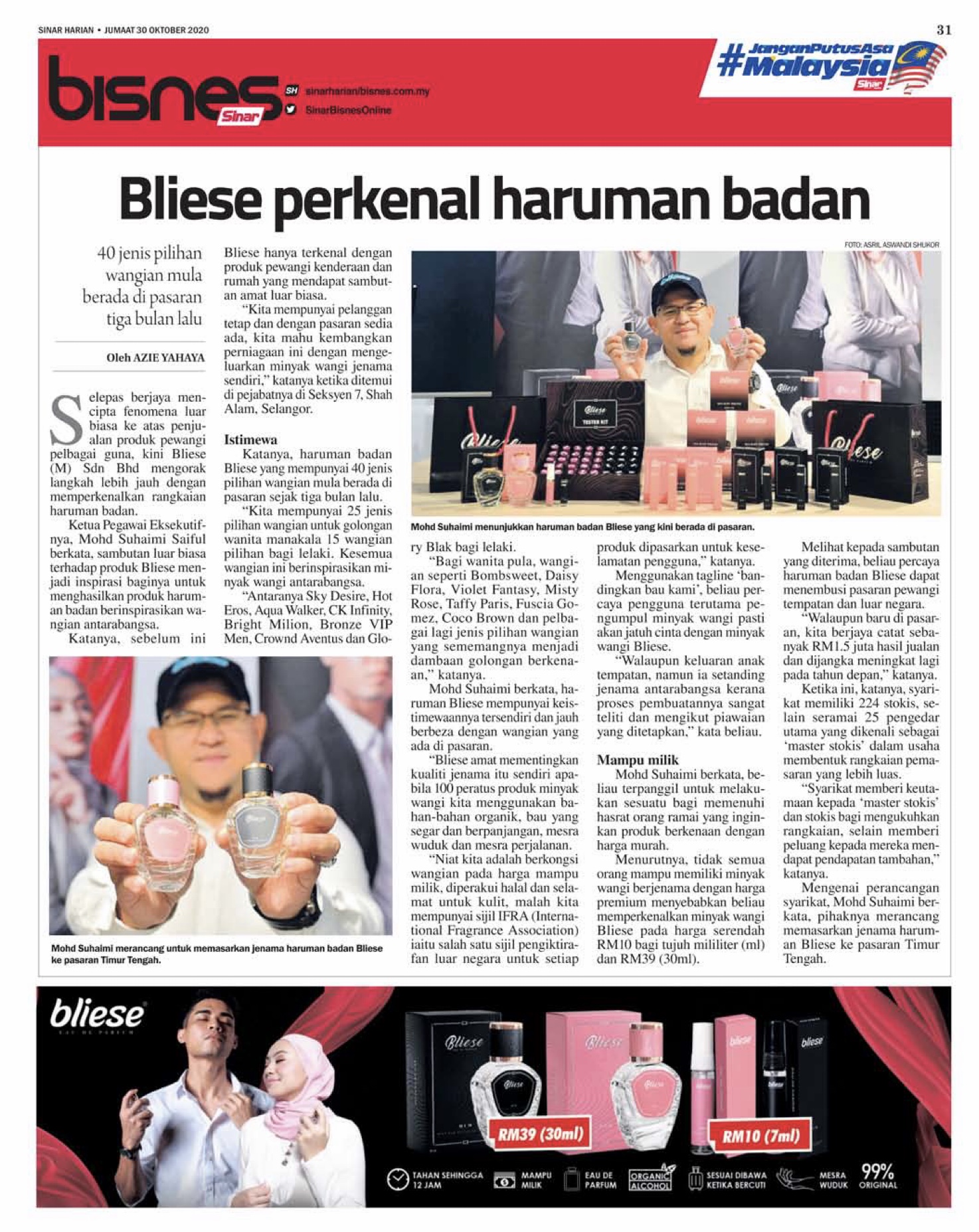 SELEPAS berjaya mencipta fenomena luar biasa ke atas penjualan produk pewangi pelbagai guna, kini Bliese (M) Sdn Bhd mengorak langkah lebih jauh dengan memperkenalkan rangkaian haruman badan. Ketua Pegawai Eksekutifnya, Mohd Suhaimi Saiful berkata, sambutan luar biasa terhadap produk Bliese menjadi inspirasi baginya untuk menghasilkan produk haruman badan berinspirasikan wangian antarabangsa. Katanya, sebelum ini Bliese hanya terkenal dengan produk pewangi kenderaan dan rumah yang mendapat sambutan amat luar biasa.