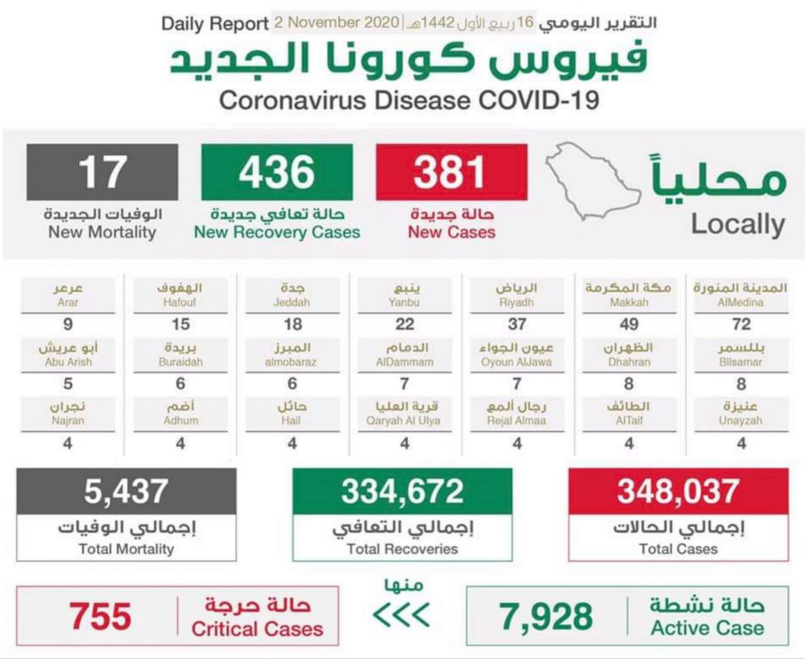 Sementara itu Madinah merekodkan kes tertinggi dengan 72 kes berbanding 85 semalam, Makkah 49, Riyadh 37, Yanbu 22 dan Jeddah 18.