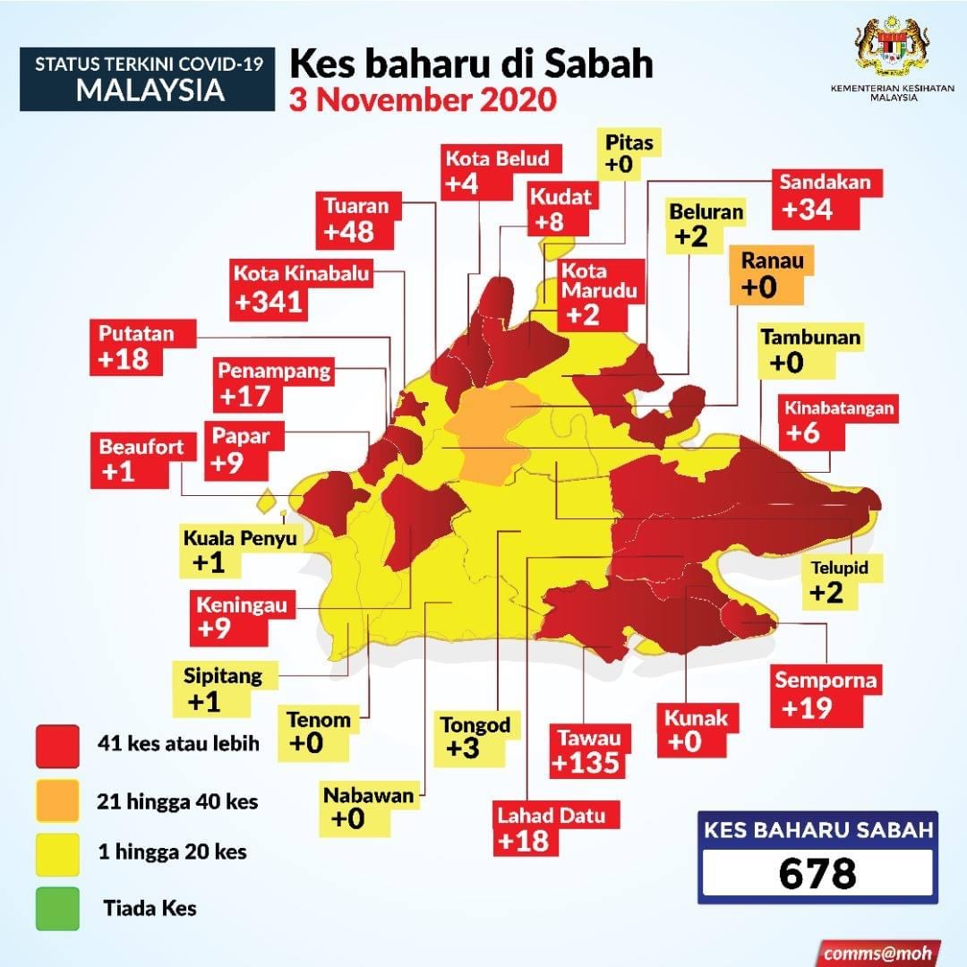 SABAH mencatatkan 678 kes bersamaan 64.3% daripada keseluruhan kes baharu yang dilaporkan pada 3 November 2020.