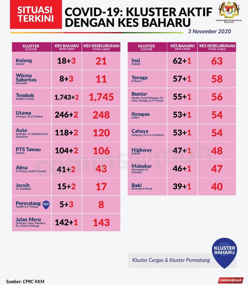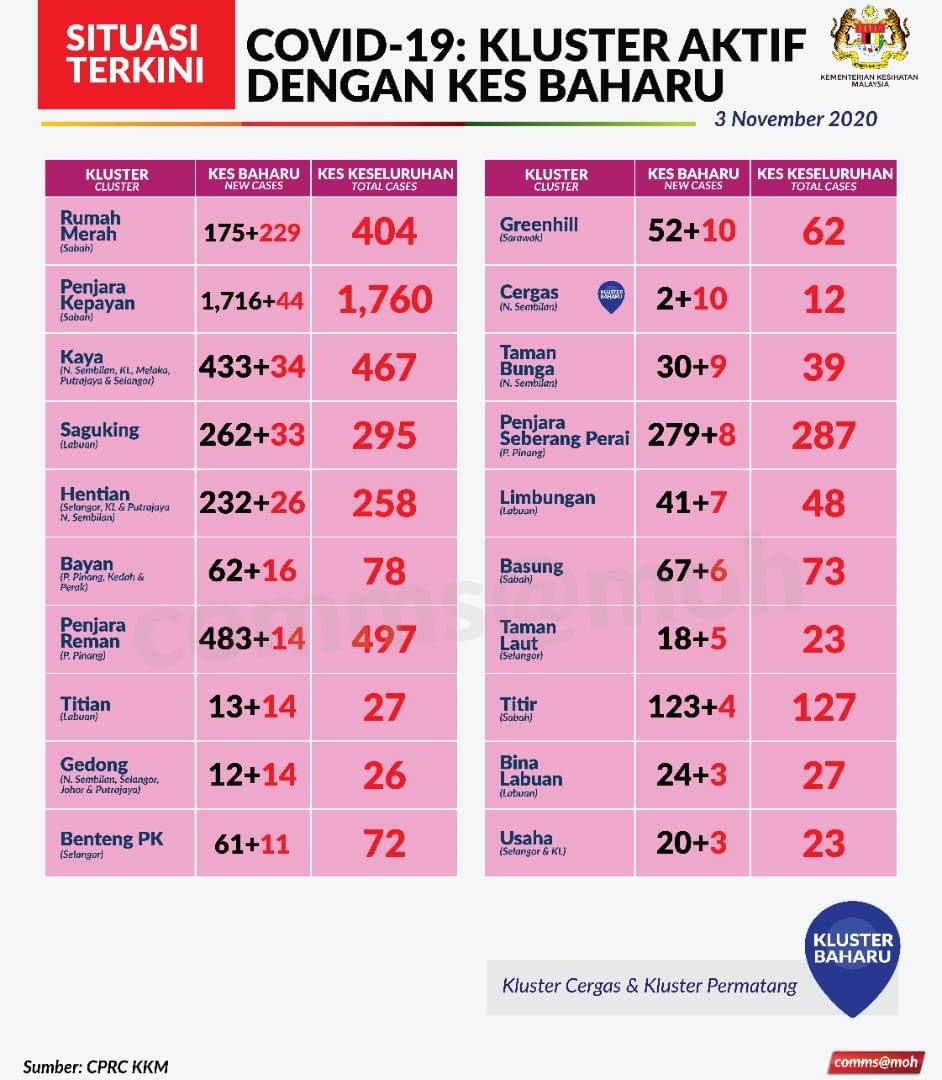 Secara keseluruhan sebanyak 38 kluster aktif dilaporkan hari ini termasuk dua kluster baharu.