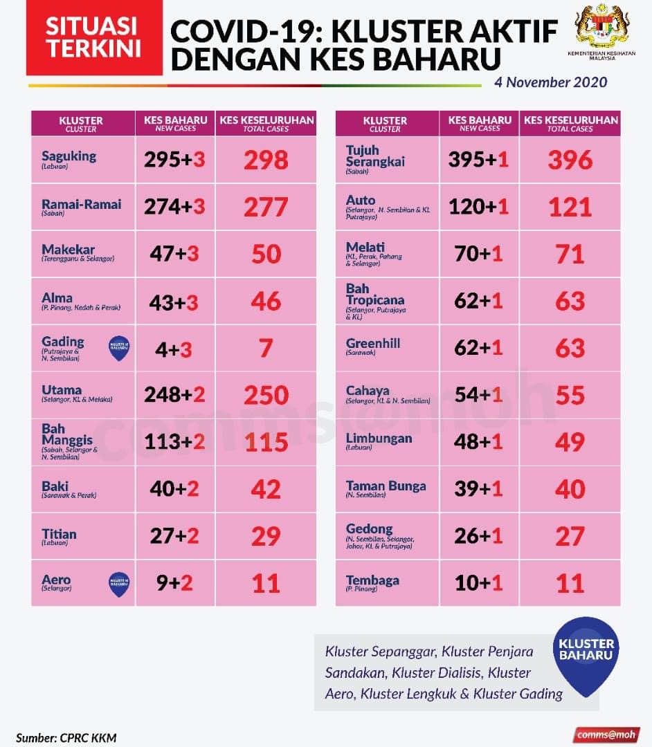 PUTRAJAYA 4 Nov. – Sebanyak 40 kluster aktif termasuk enam kluster baharu dilaporkan hari ini.