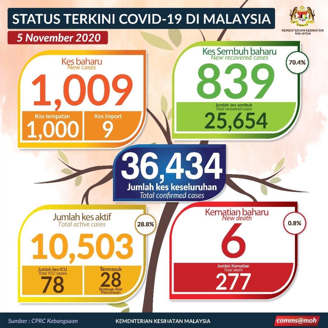 PUTRAJAYA 5 Nov. – Sebanyak 1,009 kes baharu Covid-19 direkodkan dalam tempoh 24 jam menjadikan jumlah keseluruhan kes positif kini sebanyak 36,434 kes.