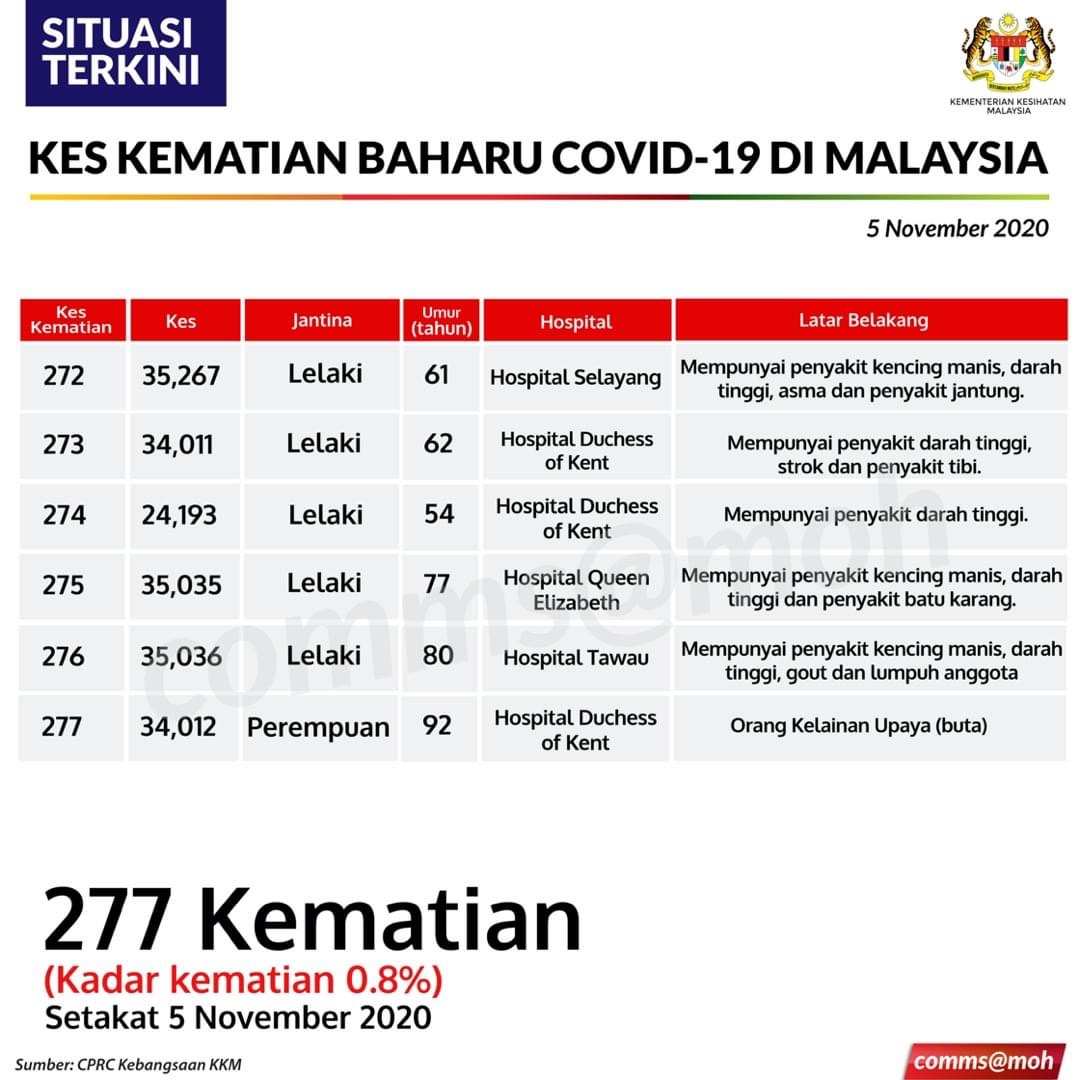 Kes kematian baharu pula sebanyak enam kes menjadikan jumlah keseluruhan kes kematian kini sebanyak 277 kes.