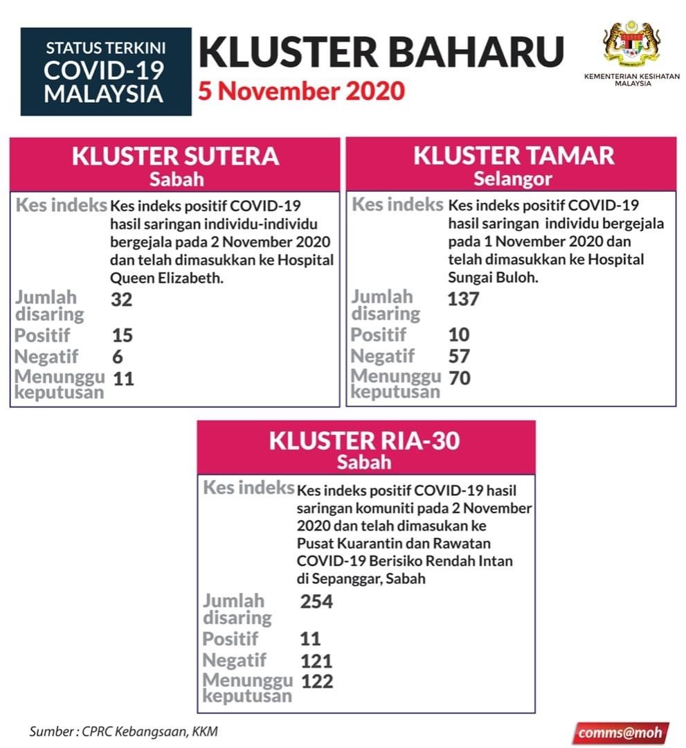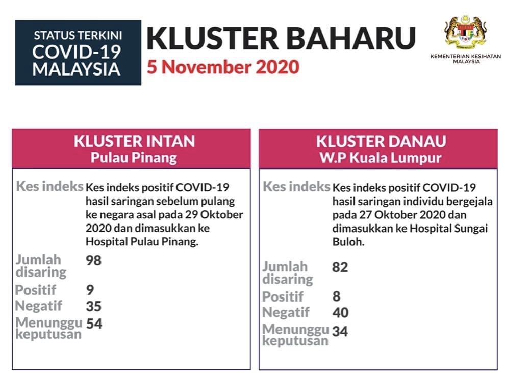 LIMA kluster baharu dilaporkan hari ini, 5 November 2020