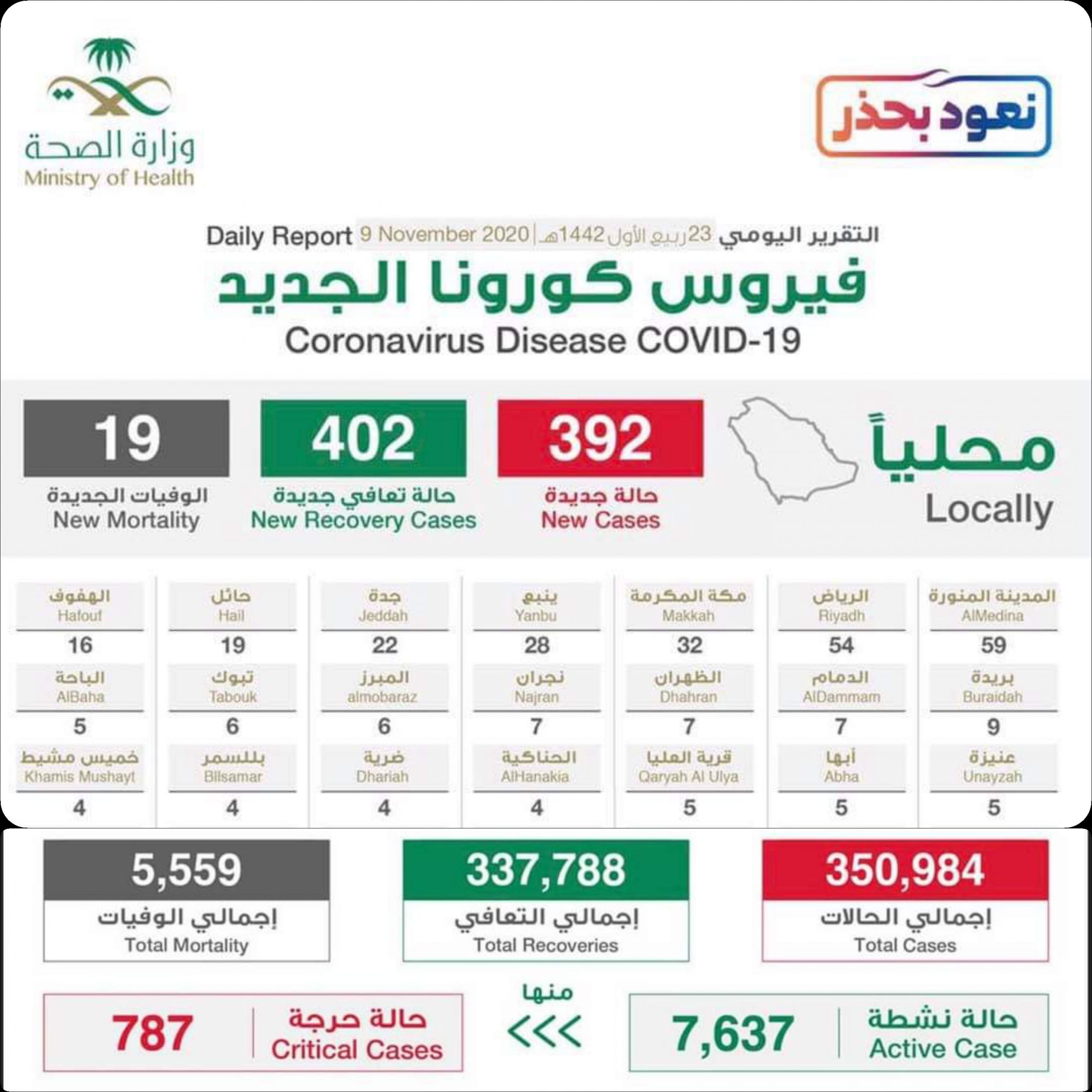 RIYADH 9 Nov. – Arab Saudi merekodkan 392 kes baharu Covid-19 pada Isnin yang membawa kepada jumlah keseluruhan 350,984 kes dengan kes aktif 7,637 di mana 787 kritikal.