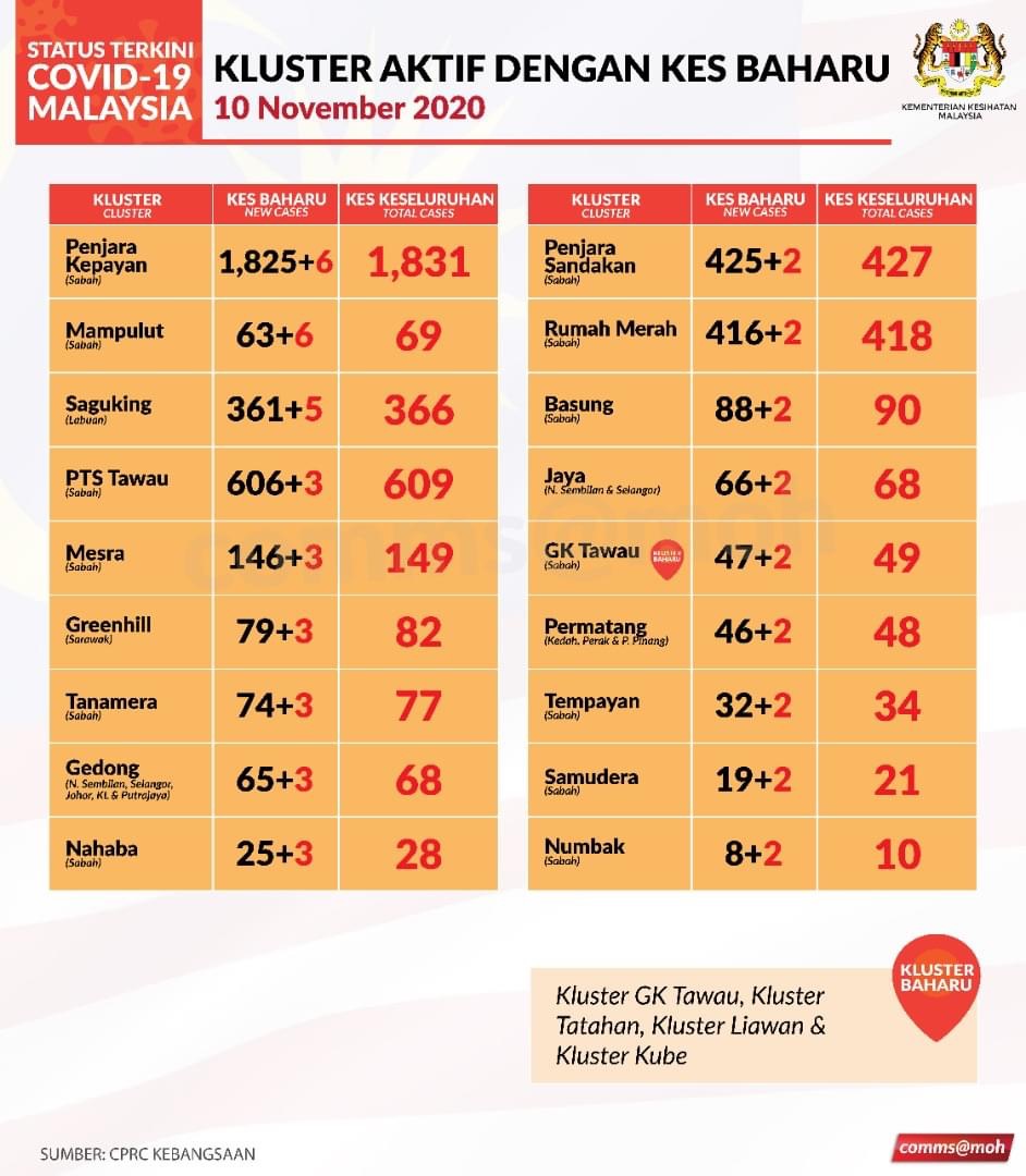 Kluster Kaya melaporkan kes tertinggi (76). Secara keseluruhan, kluster ini telah melaporkan 693 kes positif Covid-19.