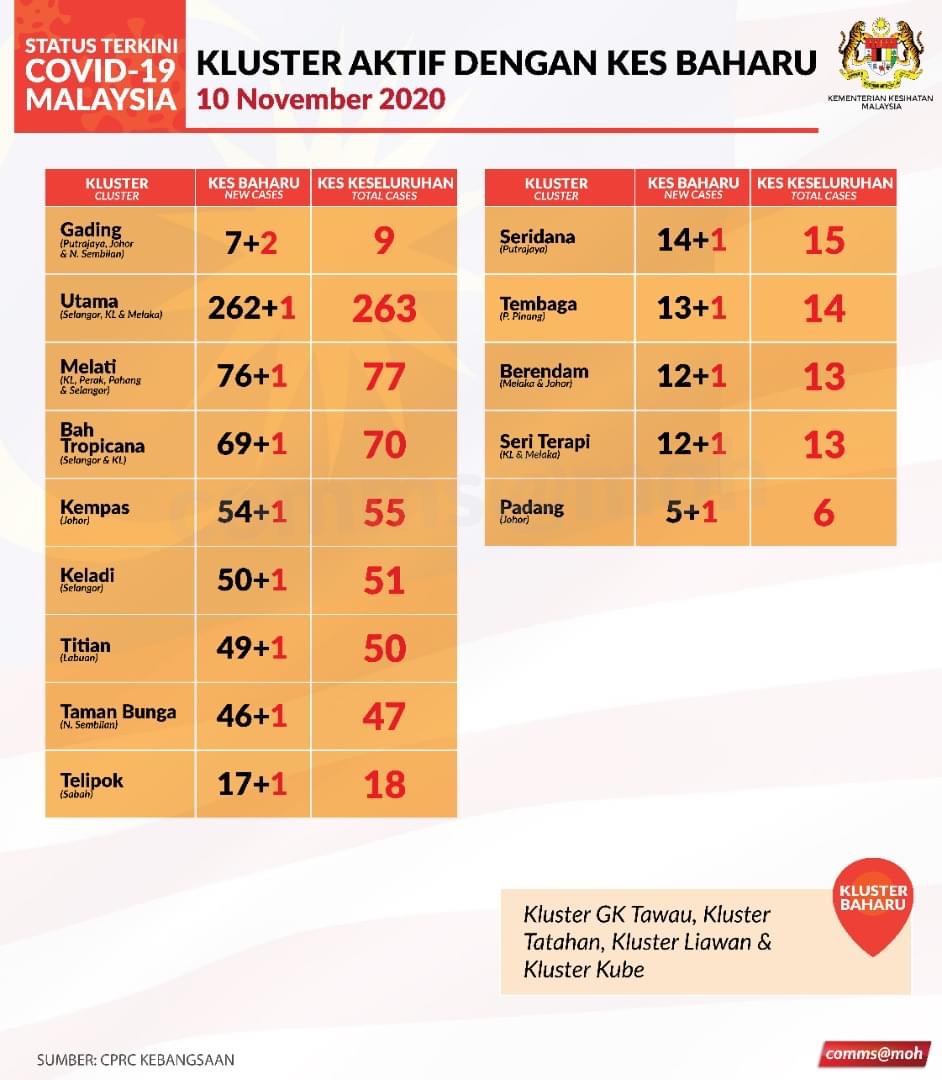 SEBANYAK 50 kluster aktif melaporkan kes baharu hari ini termasuk empat kluster baharu.