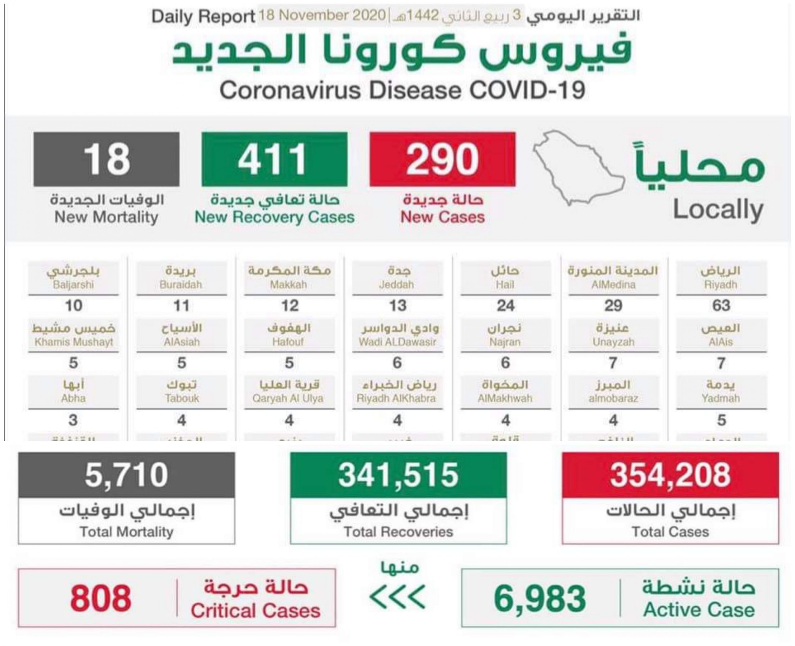 RIYADH 18 Nov. – Jika semalam angka 362 kes jangkitan dianggap terendah dalam tempoh tujuh bulan pandemik Covid-19 di Arab Saudi, hari ini jumlah kes positif lebih rendah iaitu 290 kes. Menurut Kementerian Kesihatan, jumlah kumulatif kes kini adalah 354,208 dengan kes aktif 6,983 dan daripada jumlah itu, 808 kritikal. Sebanyak 18 kematian dilaporkan yang membawa jumlah pesakit yang meninggal dunia meningkat kepada 5,710 orang. Bagi kes sembuh pula, sebanyak 411 pesakit pulih dan ini membawa kepada peningkatan kes 341,515 atau 96.41 peratus daripada keseluruhan kes. Riyadh merekodkan kes tertinggi…