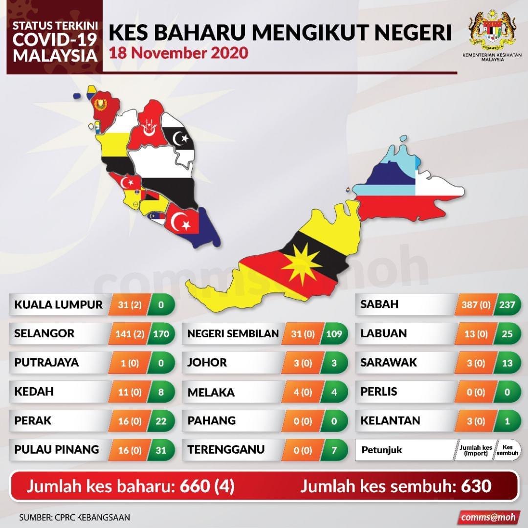 DARIPADA 660 kes, Sabah merekodkan 387 kes yang meliputi 177 kes dari kluster sedia ada, 85 kluster baharu Sabaru, Tomher dan Garden, 51 saringan kontak rapat dan 74 lain-lain saringan Selangor pula merekodkan 141 kes iaitu 65 kluster sedia ada, dua kluster baharu (Putra-18) 28 saringan kontak rapat, 44 lain-lain saringan dan dua kes import. Negeri Sembilan juga menunjukkan penurunan iaitu 31 kes, di mana 25 dari kluster sedia ada, dua saringan dan empat lain-lain saringan