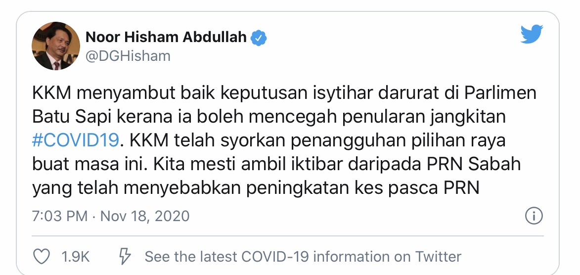PUTRAJAYA 18 Nov. – Kementerian Kesihatan sejak daripada awal lagi amat bimbang sekiranya pilihan raya diadakan sama ada ia melibatkan pilihan raya kecil, negeri mahupun umum buat masa ini bagi mencegah penularan Covid-19. Ketua Pengarahnya, Dr Noor Hisham Abdullah berkata, kebimbangan itu terbukti apabila peningkatan kes positif yang dilaporkan di Sabah dan ia menyukarkan usaha membendung penularan Covid-19. susulan pelaksanaan Pilihan Raya Negeri. “Kalau boleh, amat penting kita mencegah satu lagi pilihan raya,” katanya pada sidang media perkembangan Covid-19 hari ini. Dr Noor Hisham berkata demikian ketika diminta mengulas pengisytiharan…