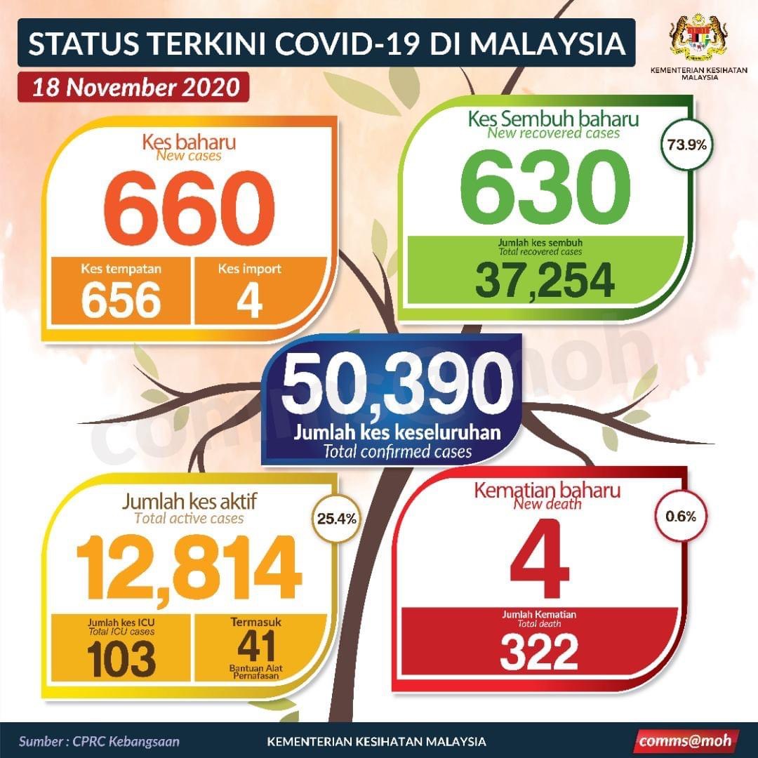 PUTRAJAYA 18 Nov. – Jumlah kes jangkitan Covid-19 kembali kepada tiga angka dengan catatan sebanyak 660 kes baharu hari ini menjadikan jumlah kumulatif kes sebanyak 50,390 kes. Ketua Pengarah Kesihatan, Dr Noor Hisham Abdullah, berkata kes baharu ini menjadikan jumlah kes aktif dengan kebolehjangkitan COVID-19 adalah 12,814 kes. Dr Noor Hisham juga memberitahu Malaysia mencatatkan jumlah 630 kes pulih menjadikan jumlah kumulatif kes pulih sebanyak 37,254 kes. “Sehingga kini, terdapat 103 kes positif Covid-19 yang sedang dirawat di Unit Rawatan Rapi (ICU), di mana 41 kes memerlukan bantuan pernafasan. Sebanyak…
