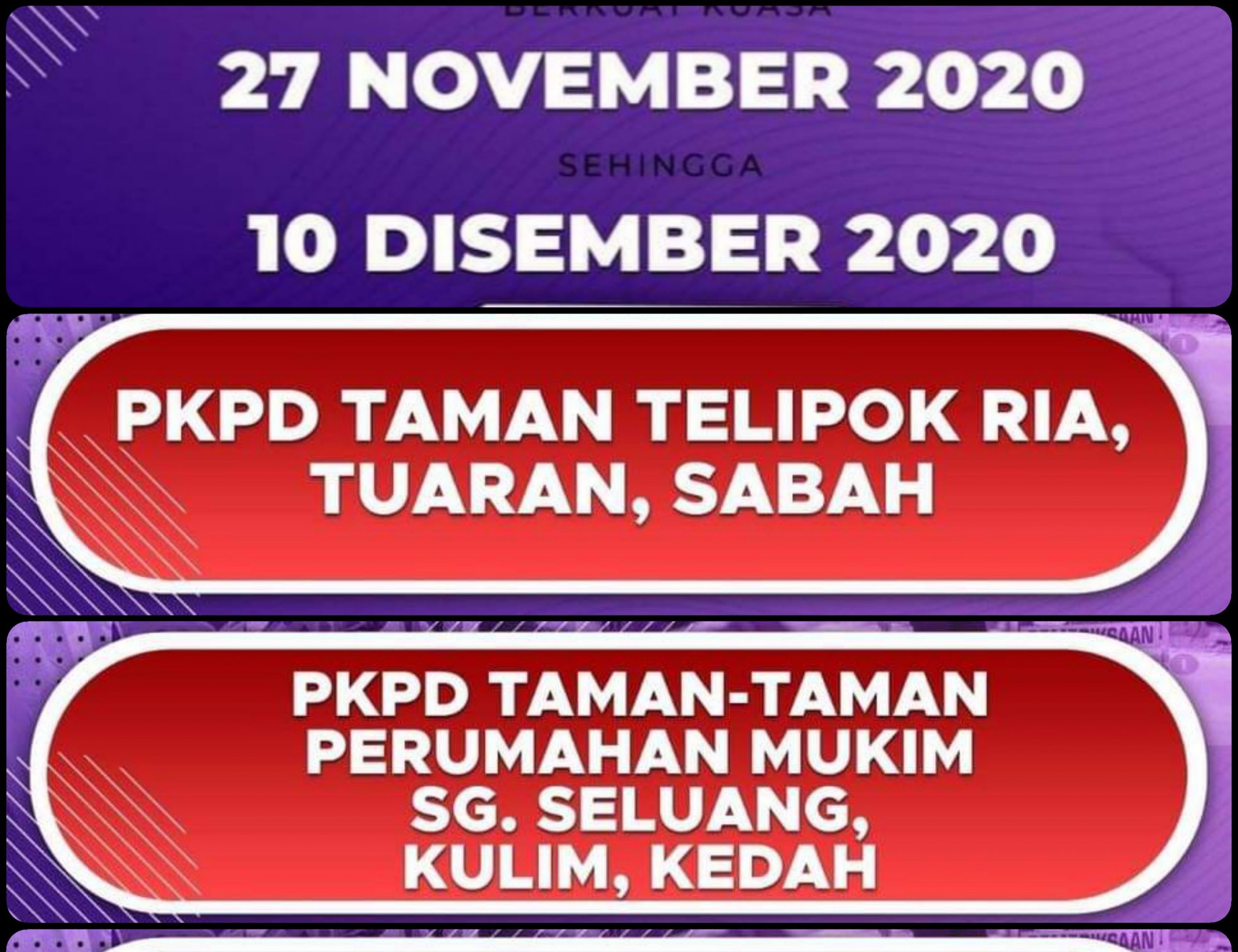 KUALA LUMPUR 25 Nov. – Dua lagi lokaliti dikenakan Perintah Kawalan Pergerakan Diperketatkan (PKPD) mulai 27 November hingga 10 Disember ini, kata Menteri Kanan Pertahanan, Ismail Sabri Yaacob.