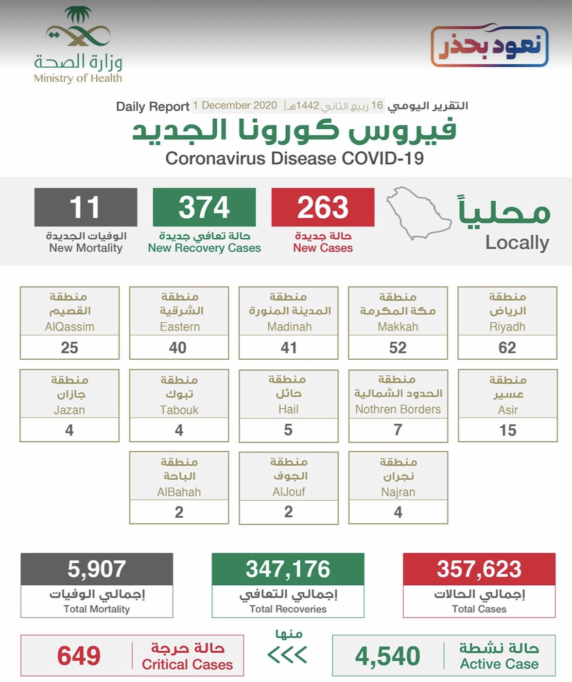 Menurut Kementerian Kesihatan, jumlah kumulatif kes positif Covid-19 di Arab Saudi ketika ini adalah 357,623 sementara kes aktif 4,540 di mana 649 kritikal.