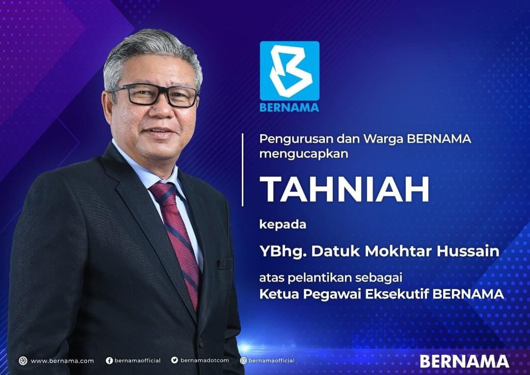 KUALA LUMPUR 2 Dis. – Tahniah Ketua Pengarang Bernama Datuk Mokhtar Hussain yang dinaikkan pangkat sebagai Ketua Pegawai Eksekutif (CEO) Pertubuhan Berita Nasional Malaysia berkuat kuasa serta-merta. Pelantikan Ketua Pengarang Bernama itu sebagai CEO diumumkan oleh Pengerusi Bernama Senator Ras Adiba Radzi. Mokhtar, 59, memangku jawatan CEO sejak 17 Mei tahun ini berikutan peletakan jawatan Nurini Kassim sehari sebelumnya. Beliau merupakan ketua pengarang sejak 23 Ogos tahun lepas dan timbalan ketua pengarang (Perkhidmatan Berita Am) selama enam tahun sebelum itu. Ras Adiba yakin Mokhtar yang berpengalaman luas dalam dunia kewartawanan, mampu menerajui pengurusan agensi berita…
