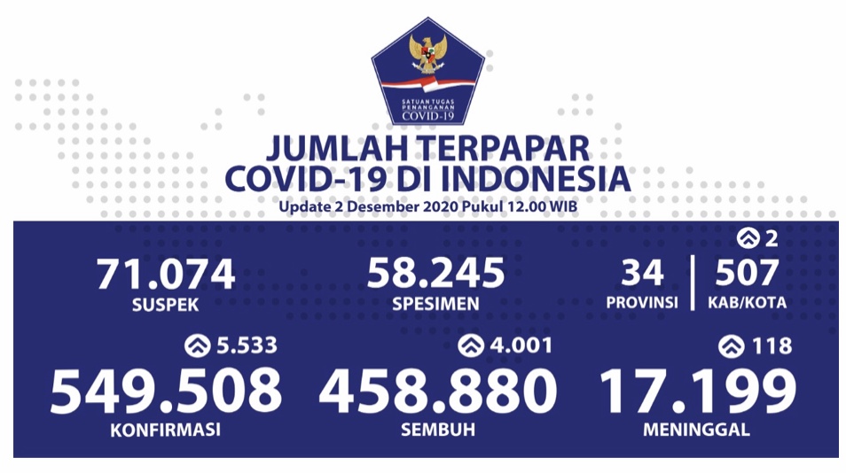 JAKARTA 2 Dis. – Kes jangkitan positif Covid-19 di Indonesia terus meningkat apabila 5.533 kes baharu dilaporkan hari ini berbanding 5,092 semalam. Dengan perkembangan ini, jumlah kumulatifnya meningkat kepada 549.508 kes dengan kes aktif sebanyak 73.429 atau 13.4 peratus dari keseluruhan kes. Menurut data Kementerian Kesihatan, jumlah kes sembuh juga menunjukkan peningkatan iaitu 458,880 termasuk 4,001 kes sembuh hari ini. Bagi kes kematian, 118 lagi pesakit meninggal dunia yang membawa jumlah kumulatif 17.199 kematian atau 3.1 peratus dari jumlah pesakit. Jakarta merekodkan kes tertinggi iaitu sebanyak 1.166 kes dan kumulatifnya…
