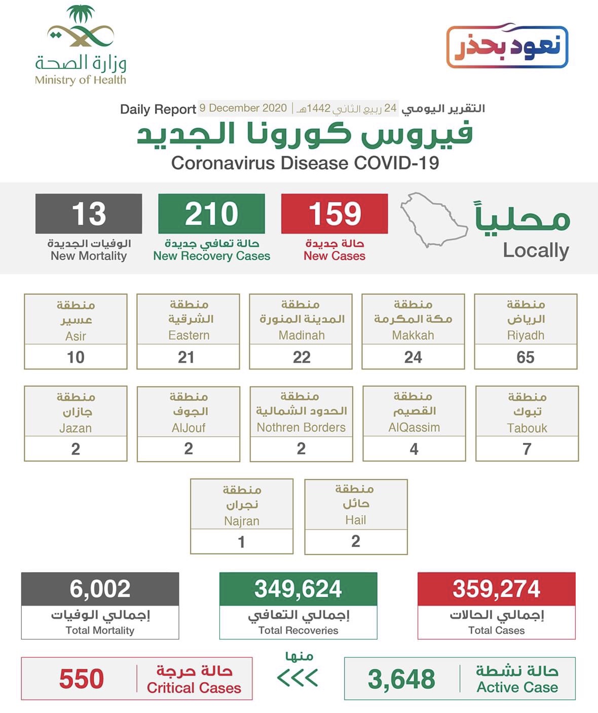 RIYADH 9 Dis. -Arab Saudi merekodkan 159 kes Covid-19, terendah berbanding sebelum ini yang menjadikan jumlah kumulatif 359,274 kes.
