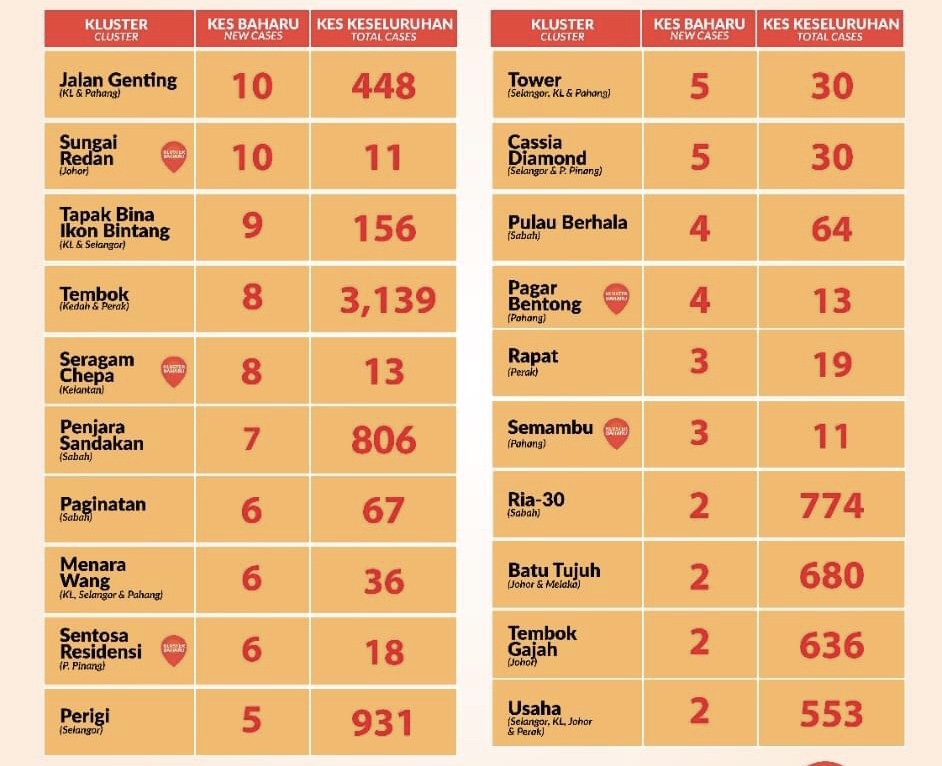 Sebelas kluster baharu yang telah dikenal pasti pada hari ini adalah: