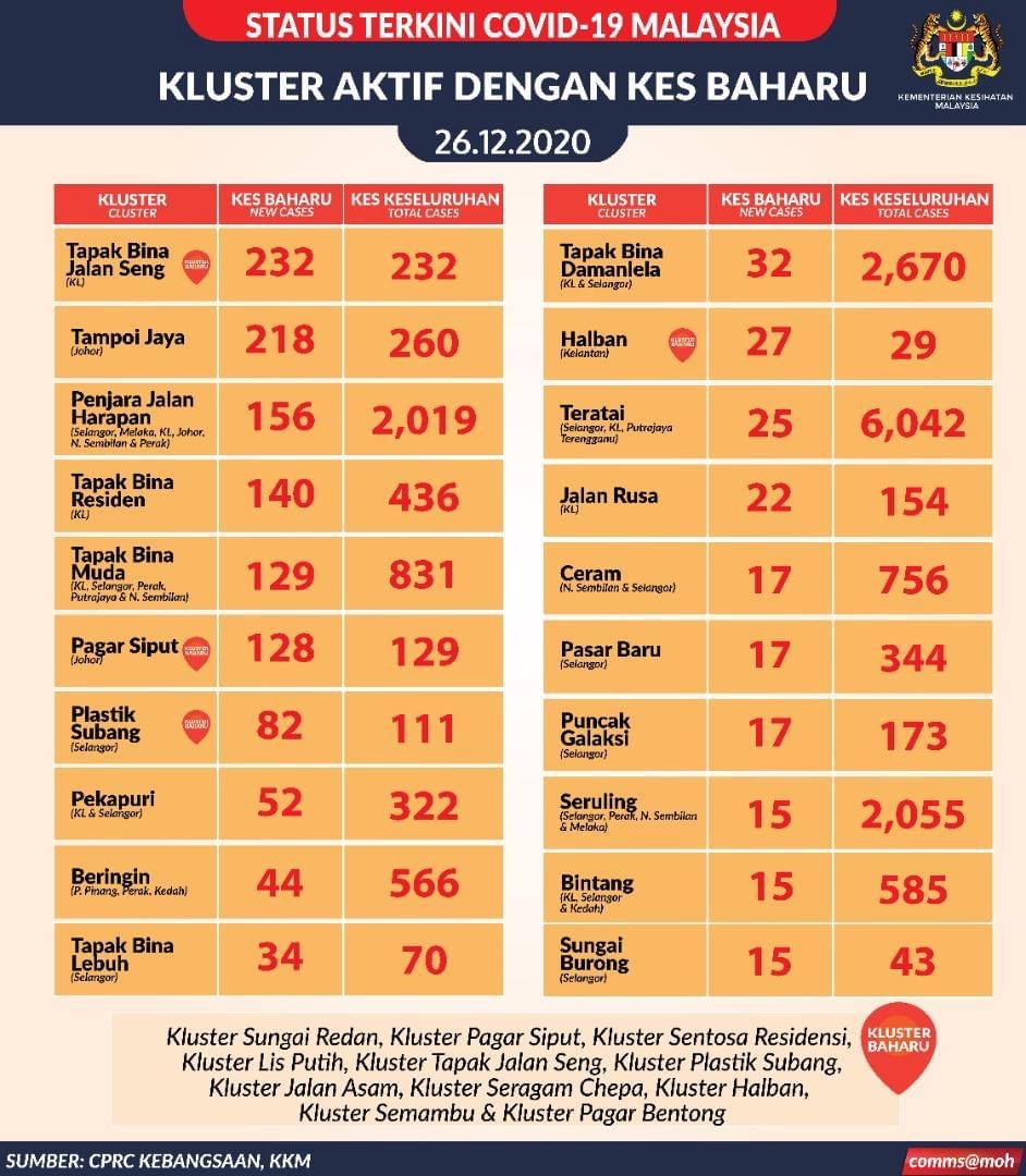 PUTRAJAYA 26 Dis. – Sebanyak 11 kluster baharu dilaporkan hari ini menjadikan 483 kluster sehingga hari ini.