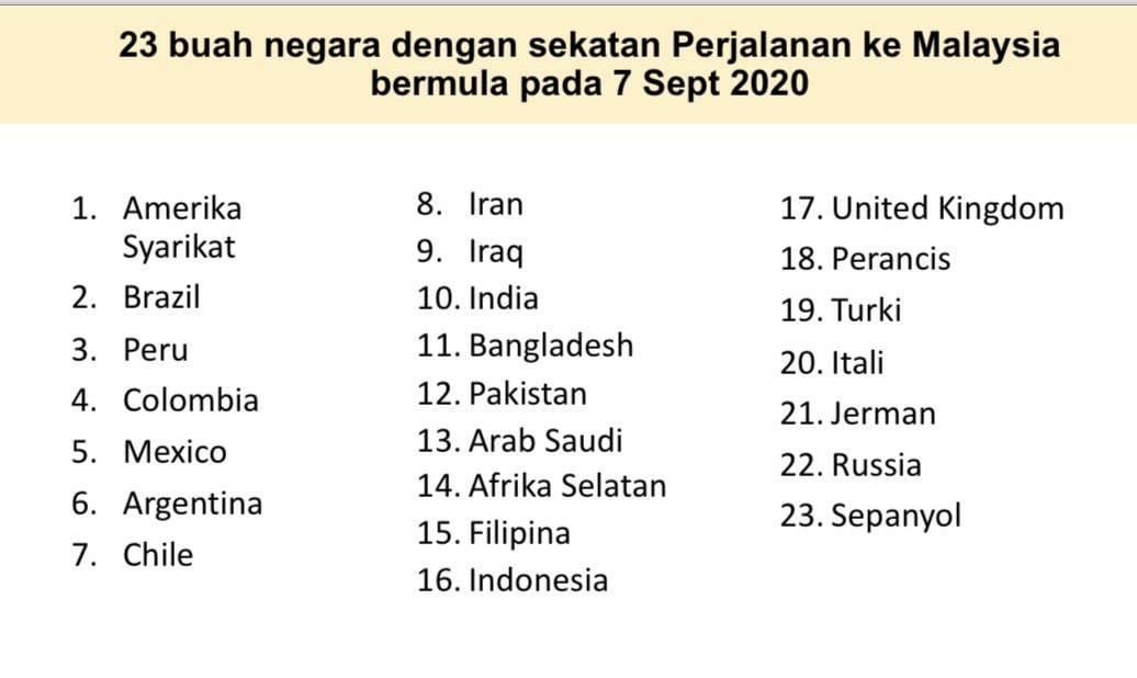 KERAJAAN masih mengekalkan sekatan perjalanan ke negara ini untuk 23 negara termasuk United Kingdom dari 7 September 2020 lagi. Susulan mutasi spike protein VUI 202012/01 pemantauan, ujian Covid-19 dan kuarantin akan diperketatkan.