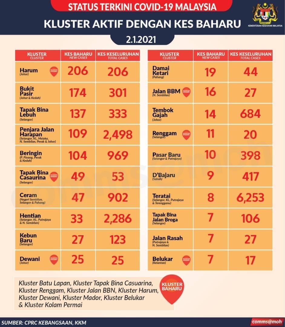 Sebanyak 45 kluster melaporkan pertambahan kes pada hari ini termasuk Kluster Harum (206 kes), Kluster Bukit Pasir (174 kes) dan Kluster Tapak Bina Lebuh (137 kes).