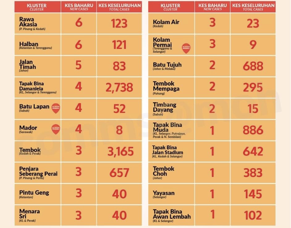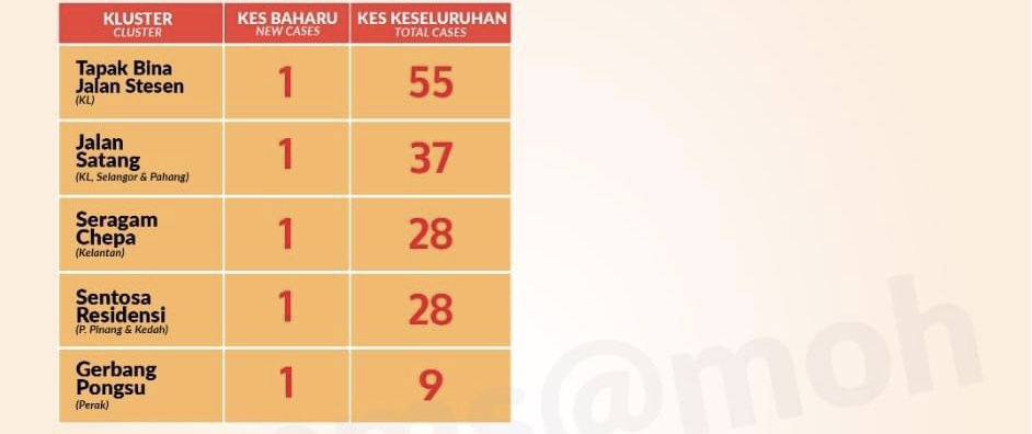 Terdapat sembilan kluster baharu dikenal pasti pada hari ini iaitu: