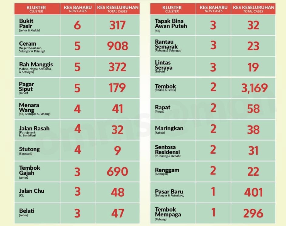 Sementara itu, lima kluster baharu yang telah dikenal pasti pada hari ini adalah :