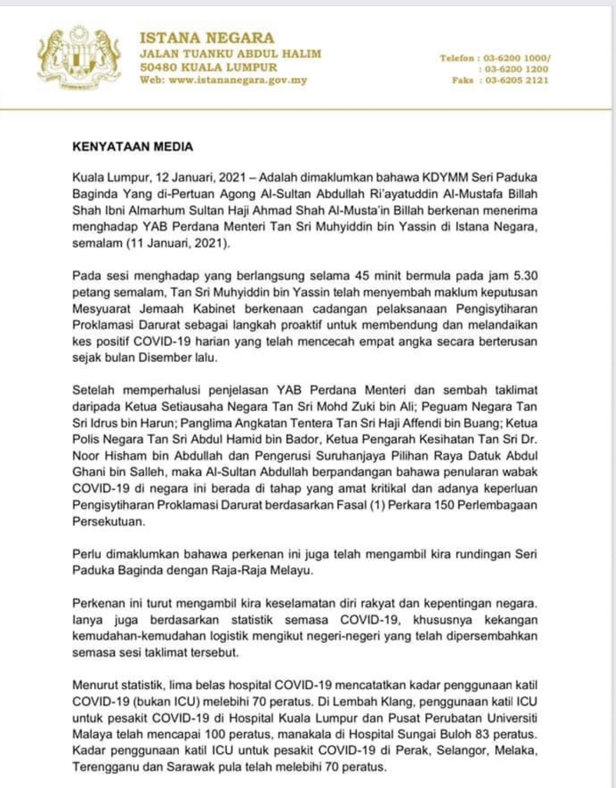 KUALA LUMPUR 12 Jan. – Yang di-Pertuan Agong, Al-Sultan Abdullah Ri’ayatuddin Al-Mustafa Billah Shah memberi perkenan supaya Pengisytiharan Proklamasi Darurat dilaksanakan sebagai langkah proaktif untuk membendung gejala wabak Covid-19.