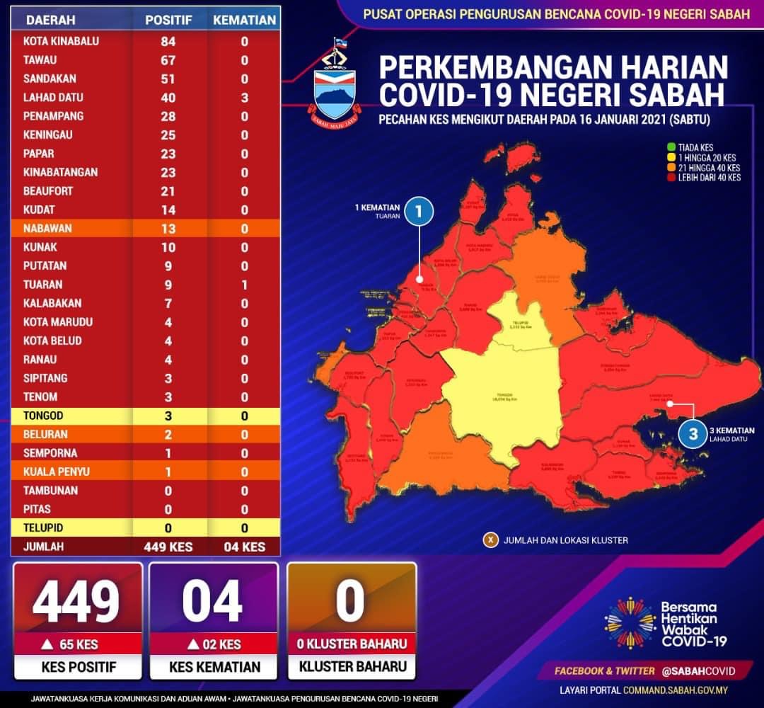 KOTA KINABALU 16 Jan. – Jabatan Kesihatan Negeri Sabah hari ini merekodkan 449 kes positif baharu Covid-19 menjadikan jumlah kumulatif sebanyak 43,251 kes dengan empat kematian direkodkan iaitu tiga di Lahad Datu dan satu di Tuaran.. Sebanyak 379 pesakit Covid-19 telah sembuh hari ini menjadikan jumlah kumulatif sembuh 38,989 orang. Sejumlah 2,957 pesakit sedang menerima rawatan iaitu 762 orang di hospital dan 2,195 orang di Pusat Kuarantin dan Rawatan Berisiko Rendah (PKRC). Bilangan pesakit Covid-19 dalam ICU ialah 77 orang dan 19 orang pula memerlukan alat bantuan pernafasan (ventilated). Daripada…