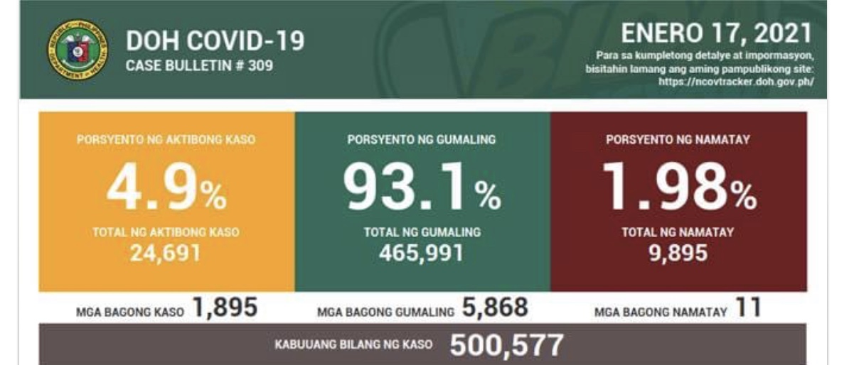 MANILA 17 Jan. – Filipina setakat pukul 4 petang hari ini merekodkan 1,895 kes baharu Covid-19 menjadikan jumlah keseluruhan kes 500,577. Menurut Jabatan Kesihatan (DoH), sebanyak 11 lagi pesakit dilaporkan meninggal dunia dan ini membawa kepada 9,895 kematian. Sementara itu, kes sembuh juga menunjukkan peningkatan dengan merekodkan jumlah kumulatif 465,991 orang atau 93.1 peratus daripada jumlah keseluruhan kes. Mengikut rekod, kes sembuh hari ini adalah 5,868 pesakit dan jumlah kes aktif pula adalah sebanyak 24,691.